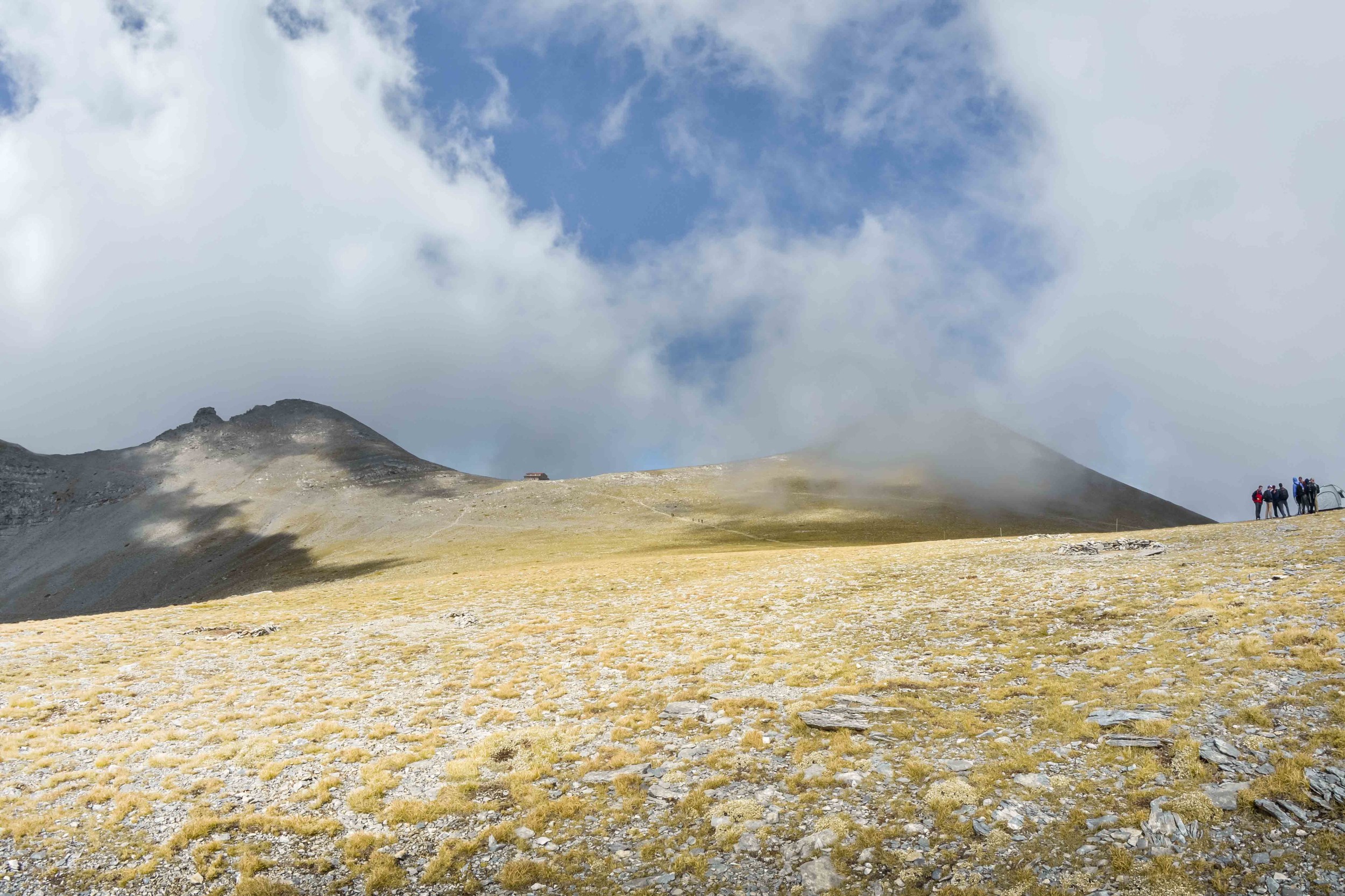At 2,480 metres, we reached an intersection, which, to the right, leads to Louki, and straight ahead, to Kakoskala. From this point upwards, mistakes are not forgiven. If not equipped with helmet and gear, and not accompanied by an experienced guide or mountaineering club members, you may choose to take a simpler route all the way to the Skolio peak, at 2,911 metres. Or you can opt to go no further and simply enjoy the rock formations and view. On days with few clouds, nearly half of mainland Greece is visible from Mount Olympus, a view taking in Thessaloniki, Halkidiki, even Larissa and the Thessalian plain. Even when there are clouds, this position hovers above them, a unique feeling. Visible to the right of Mytikas, the highest peak, is Stefani, a peak also known as the Thrown of Zeus, as a result of its shape. From the Agapitos refuge, it will take you roughly 3 hours to reach the summit, either via Kakoskala or Louki.