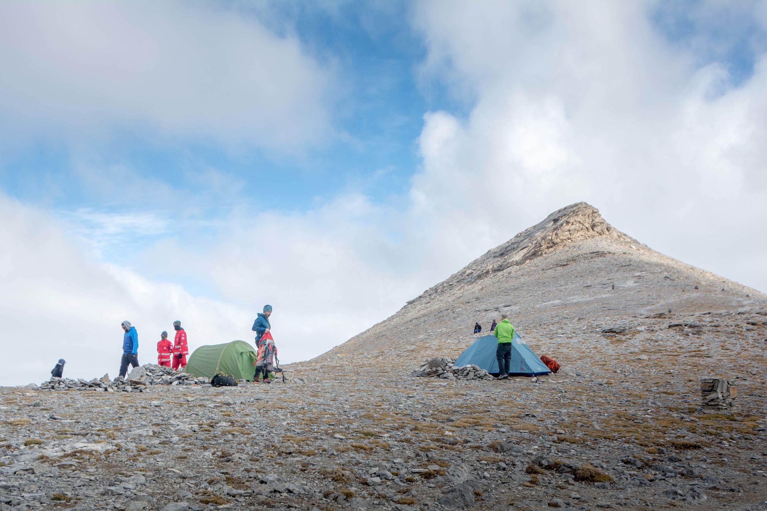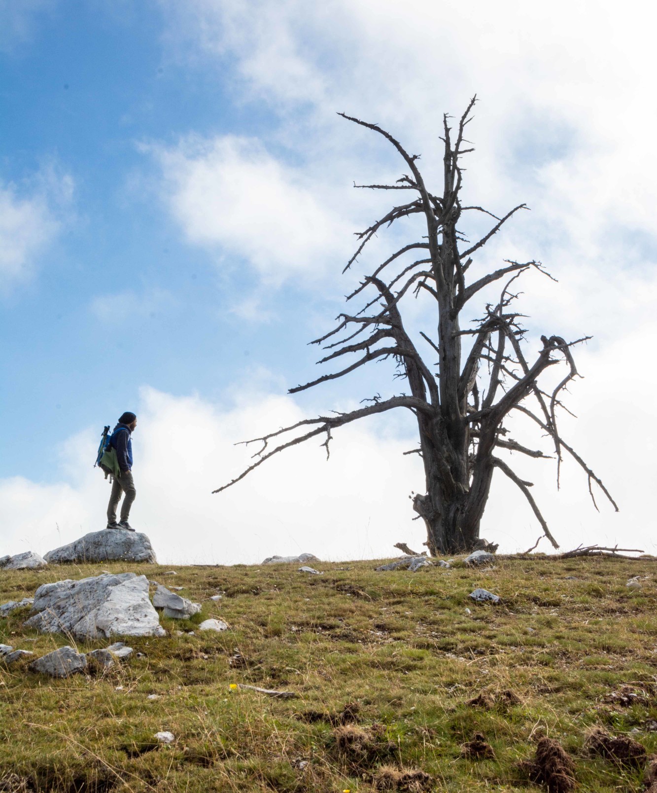 The alpine landscape begins from the refuge upwards. This is the section that is visible to all when moving along the Athens-Thessaloniki highway – enormous naked rocks lost in a veil of clouds. From this point upwards, the cold weather is intense, even in June, when sunny. As we reached higher, through scattered Bosnian pines, we observed the edges of the rocks, sculpted by the wind, rain and snow. As the altitude increased, we took from our backpacks whatever clothing we had and wore it for protection against the chilly weather.