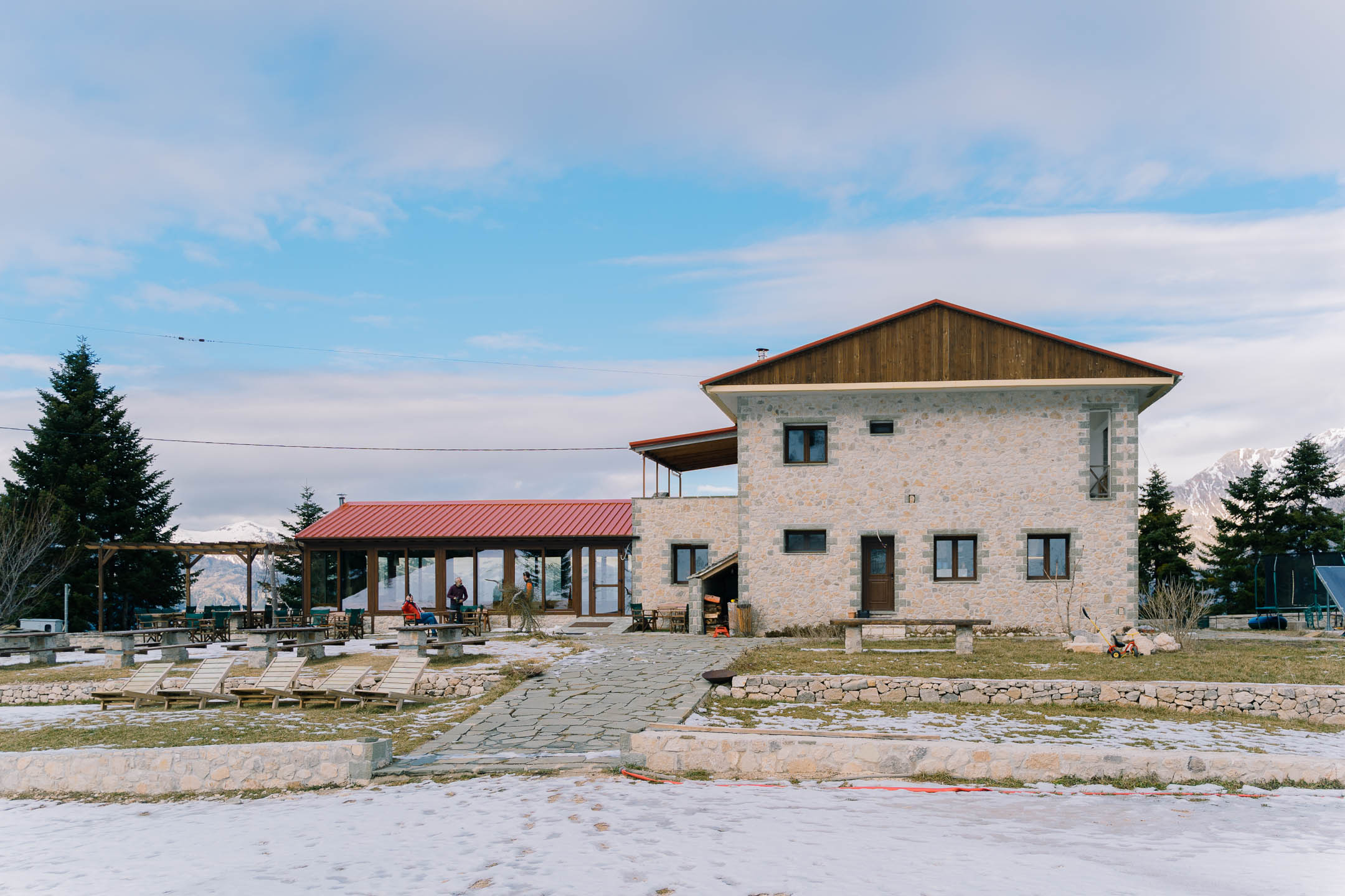 The Munti Smolikas guesthouse is located in a 1901 building that used to be the village school. In addition to the guesthouse, the village cafe, which has always served as a gathering place, is also still in operation today. The guesthouse has five rooms with private bathrooms, including two 8-bed rooms, two 4-bed rooms, and one 6-bed room. Each room is equipped with bed linens, towels, heating, and hot water. The kitchen is open all day and offers full meals, provisions for the mountain, and various snacks. (https://muntismolikas.com/)