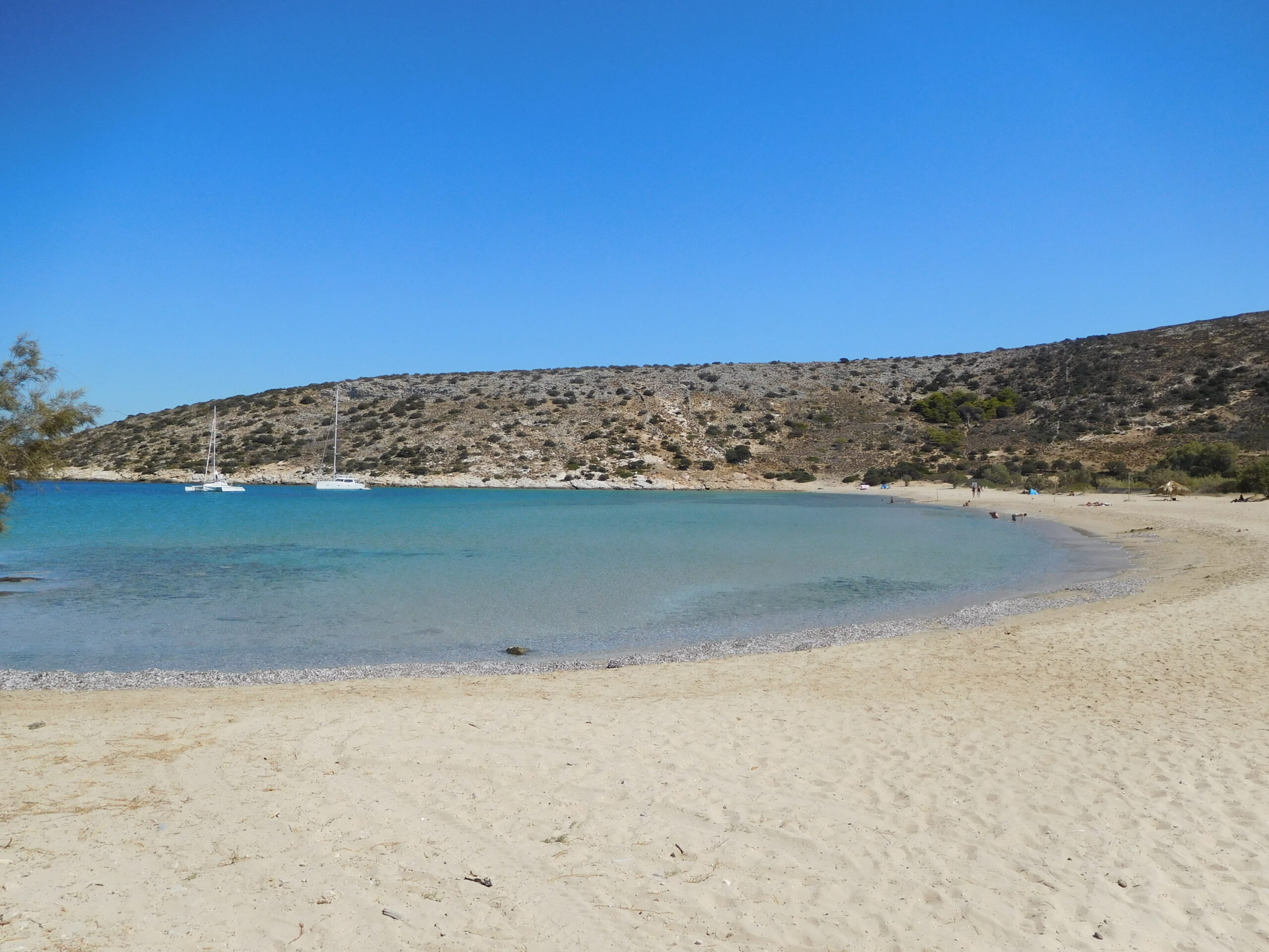 You can enjoy swimming and playing on the beach, while there’s also natural shade. Grab a spot under a tamarisk tree, swim in the clear waters and admire the view towards Schinoussa that you can see in the horizon when the atmosphere is clear.
