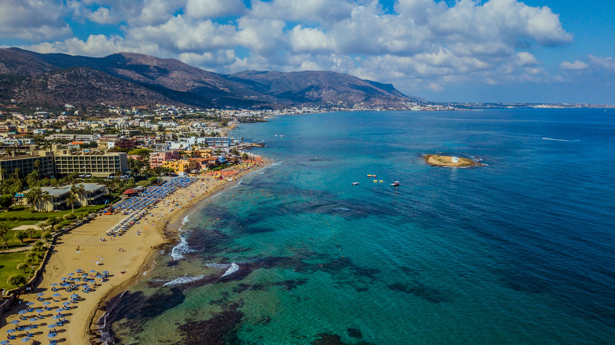 Reaching the coast once again, trying to avoid the busy beaches of Hersonissos, we opt for quieter destinations. Across from Heraklion, you’ll find Dia island, where you get by boat. Next to Hersonissos, towards Heraklion, there’s a series of small bays that include quiet beaches, like for example the gorgeous sand beach at the base of Sarantaris, with a cave and amazing emerald waters.