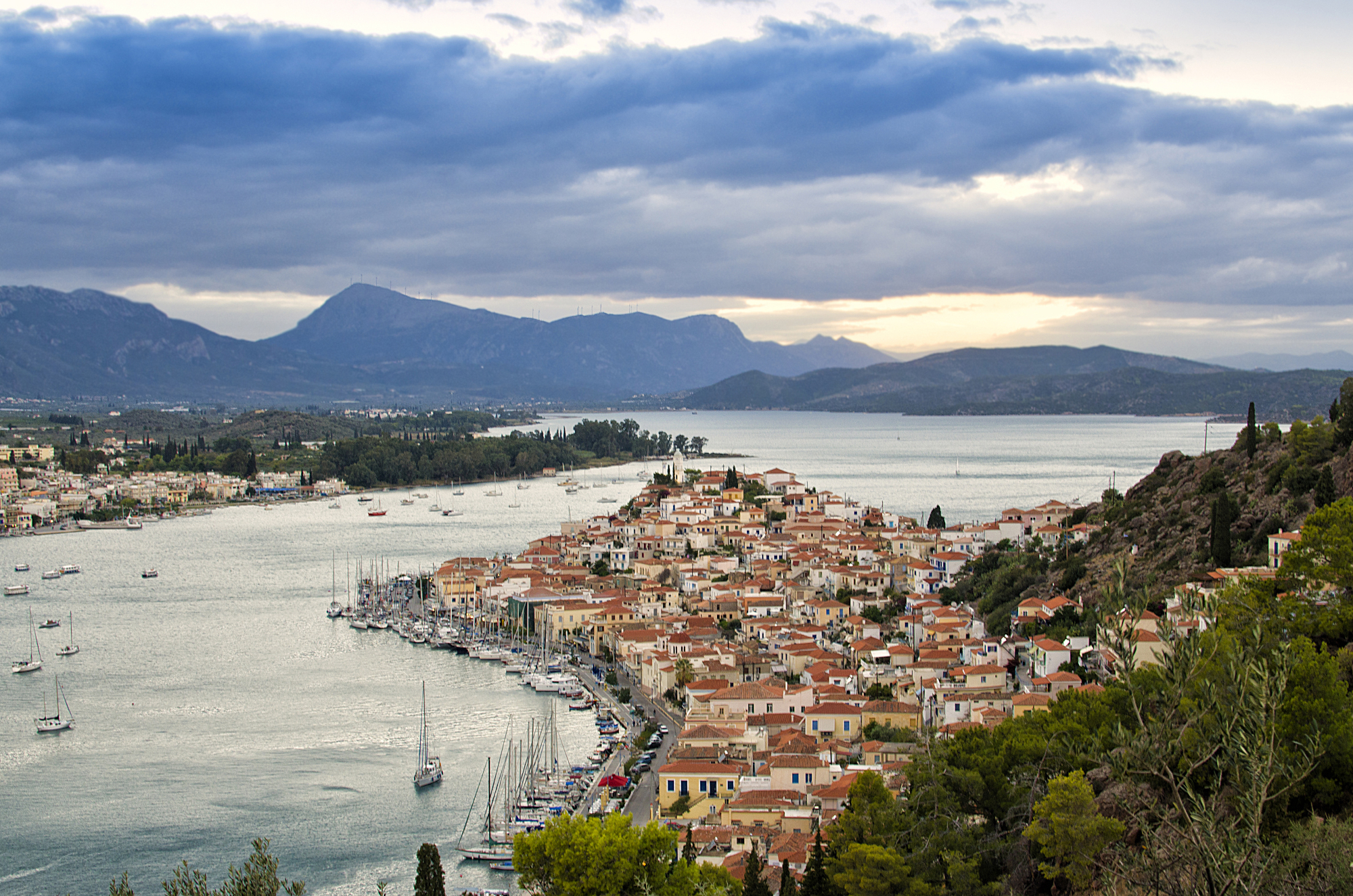 Poros is comprised of two islands, Sphaeria, the capital and port, and Kalaureia. They are linked by a bridge over a narrow strait. The island-pair, situated very close to the coast of the Peloponnese, is easy to reach by taking the road to the Corinth Canal, Epidaurus and Galatas, from where a boat offers regular crossings to Poros. Visitors can also travel to the island by ferryboat, direct from Piraeus port. The main town of Poros looks out towards Troizinia, in the Peloponnese’s northeast, is built amphitheatrically, and features lovely neoclassical houses offering enjoyable viewing while taking a seaside stroll. The clock tower, built in 1927 on a small lush hill, is an island landmark with a view reaching Galatas. The clock tower’s construction was funded by Ioannis Papadopoulos, a Troizinia-based politician hailing from Poros. He had bought the clock’s mechanism, a state-of-the-art system for its time, from the US.