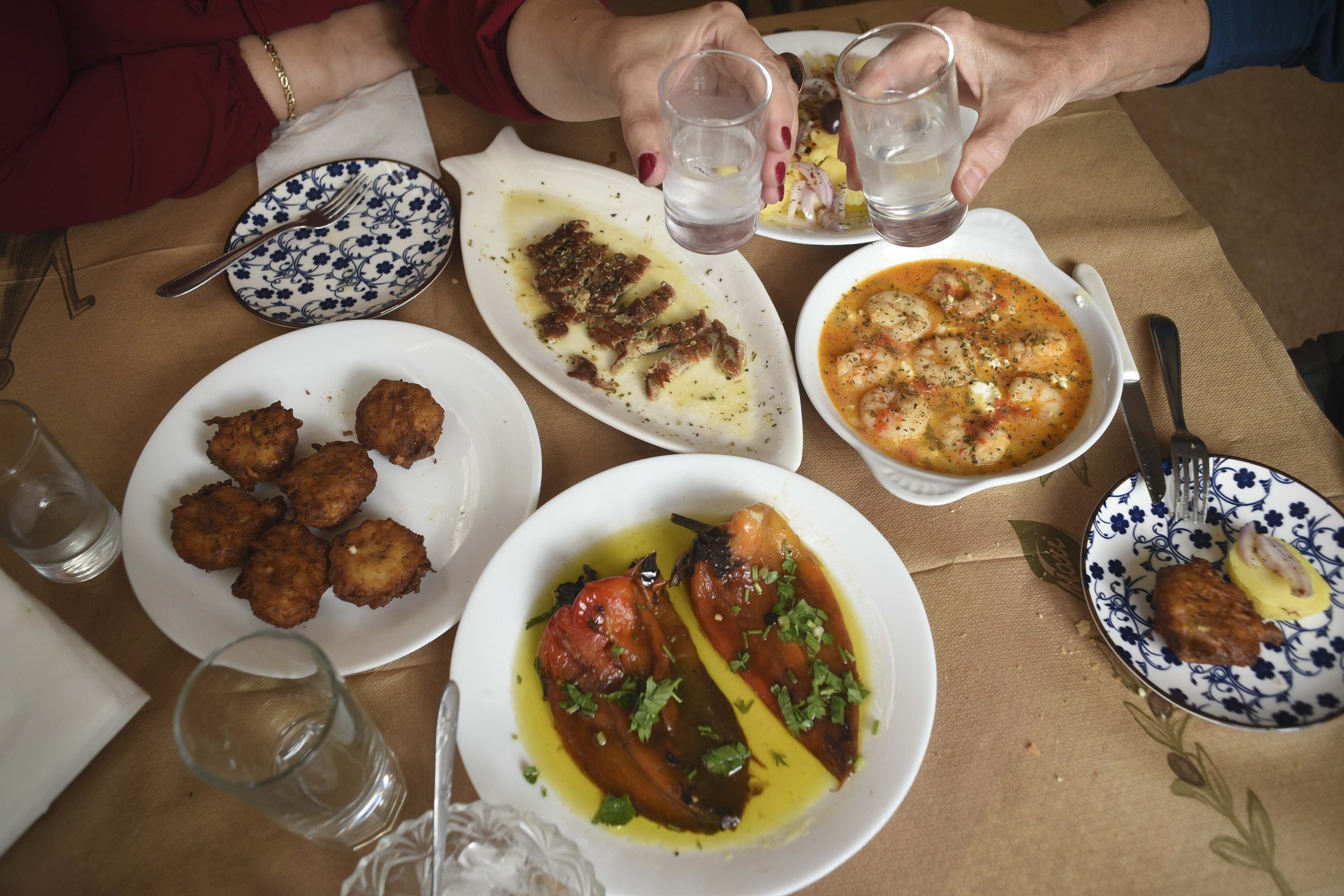Vicky and Damianos, Giorgos’ children serve abundance. The “various pickles” with tomato, cabbage and cauliflower, the stuffed Florina red pepper with cabbage, celery and carrot that is dipped in vinegar and then put on the plate, the stuffed aubergine with pepper and kasseri cheese, the courgette balls. And the stove is turned on.