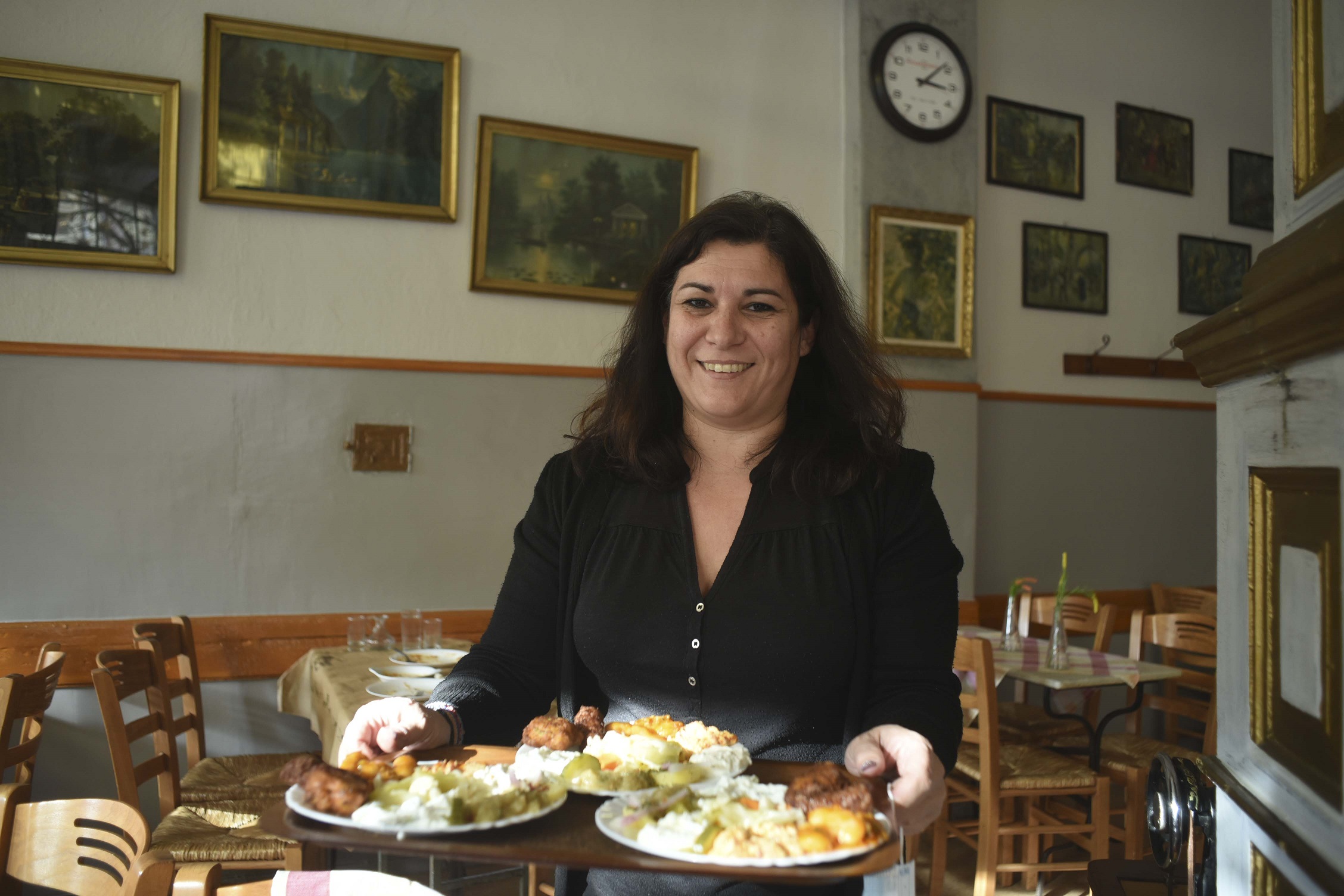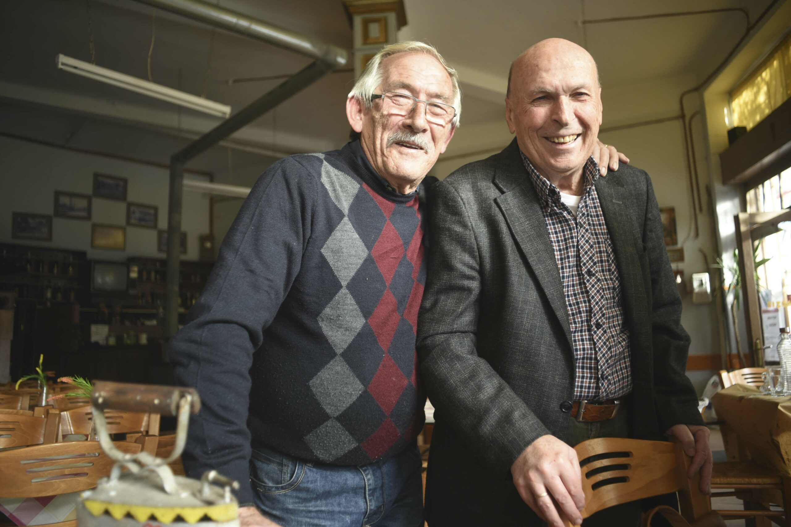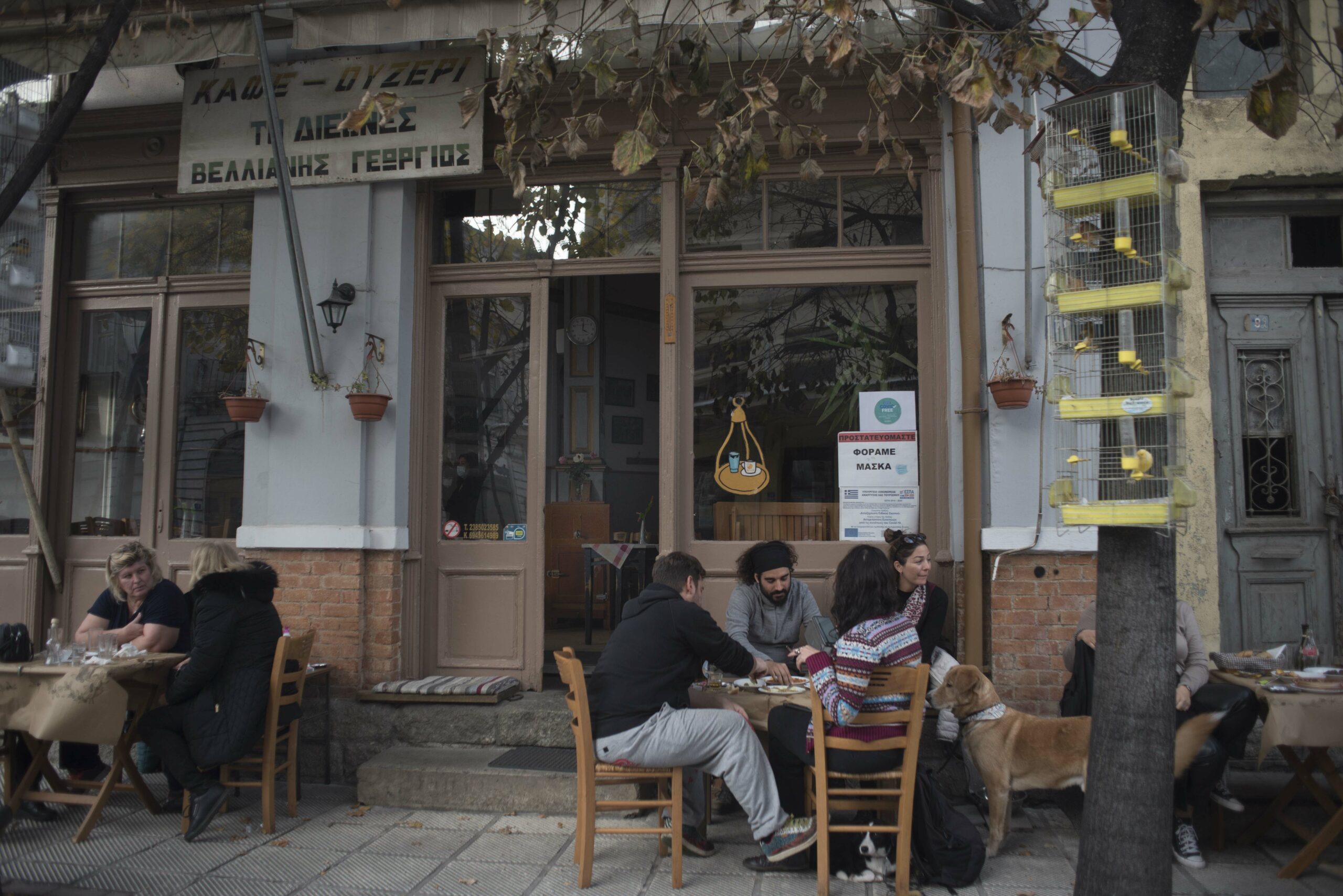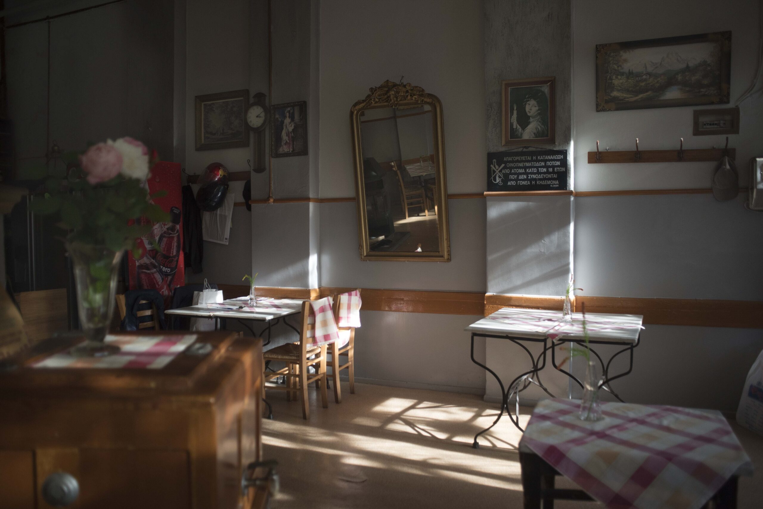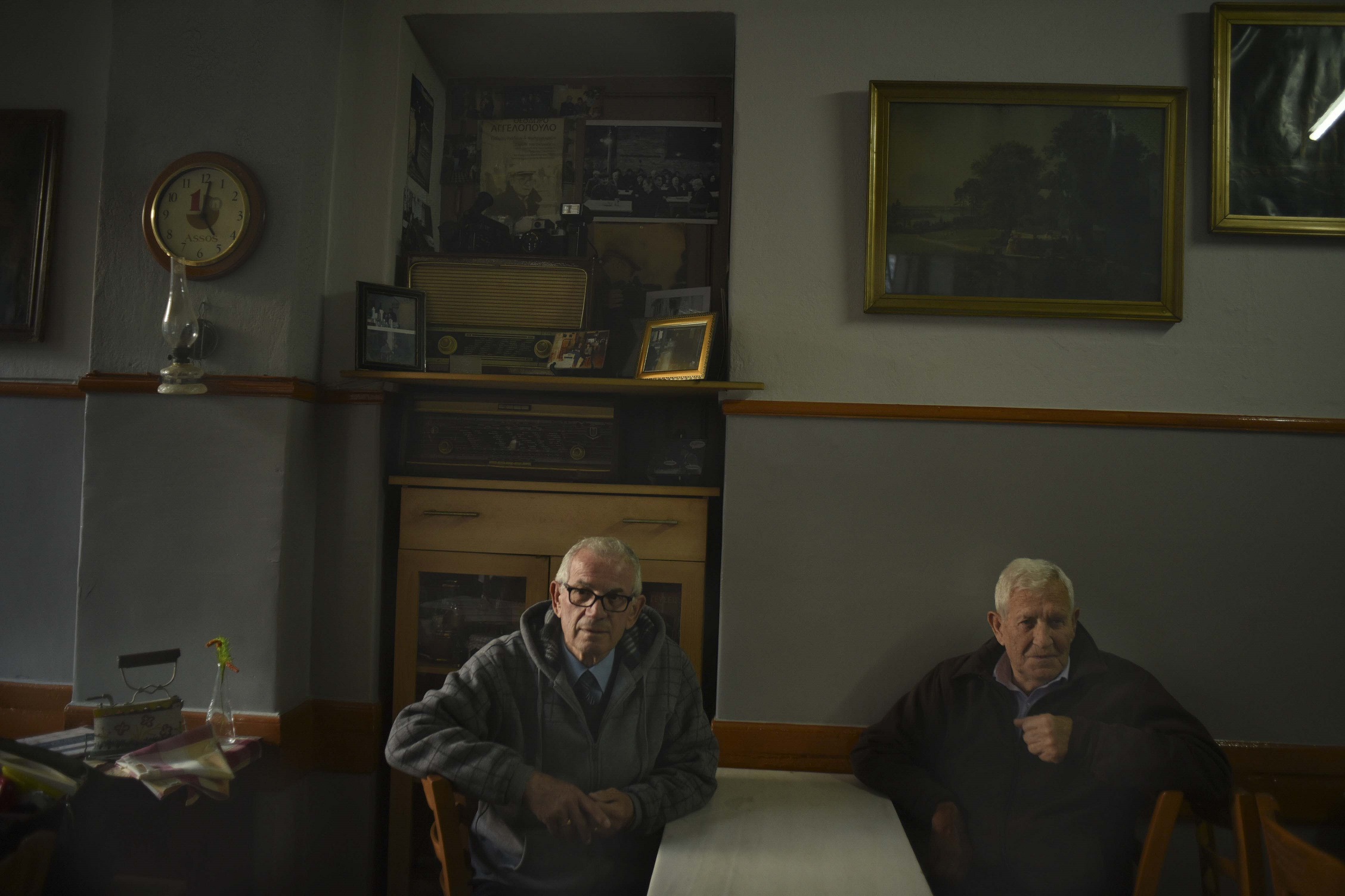It’s five o’clock. The sweet elderly regulars are waiting to get in to have their coffee and play cards. With a childish amazement the whole micro community of “Diethnes” poses for the camera.