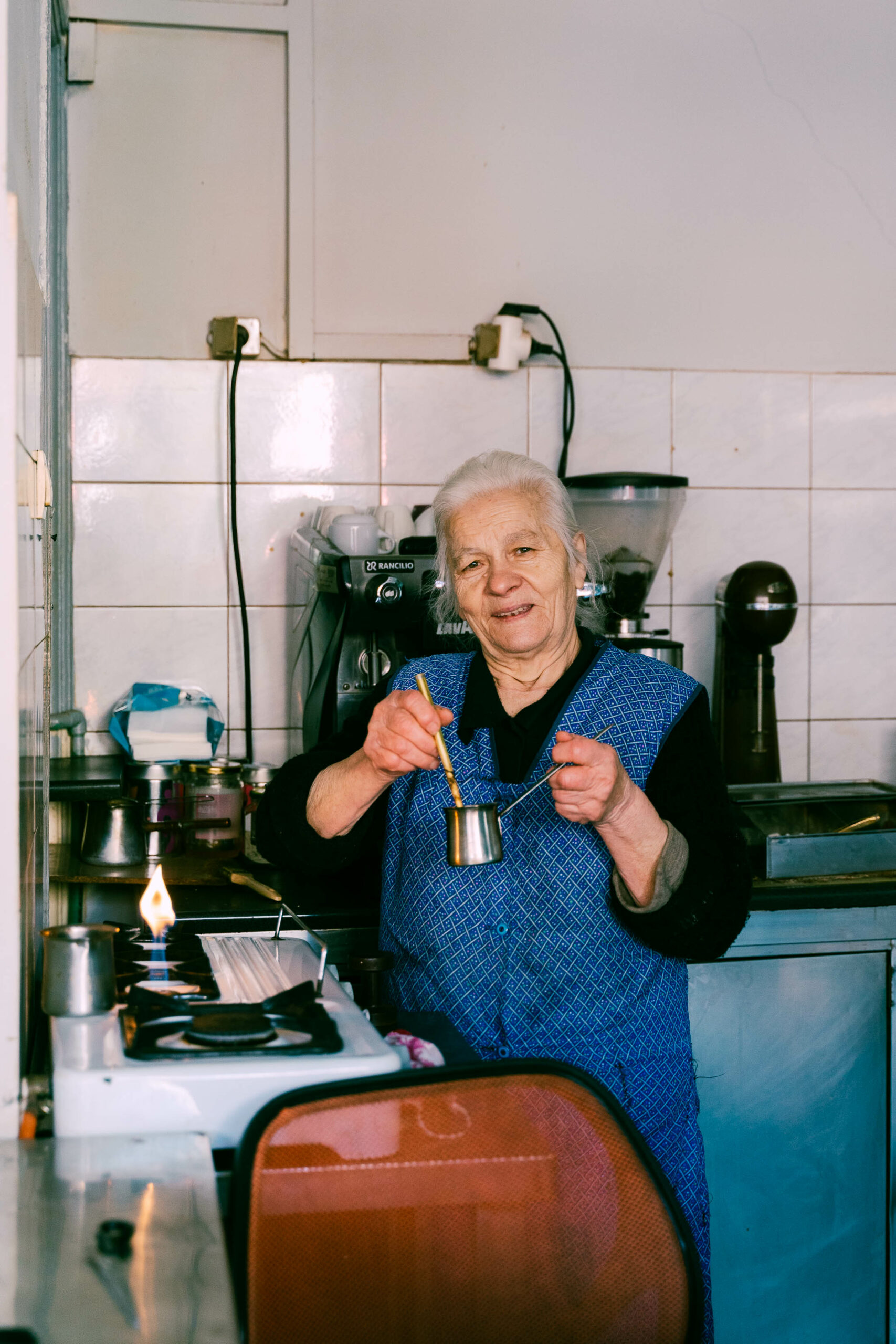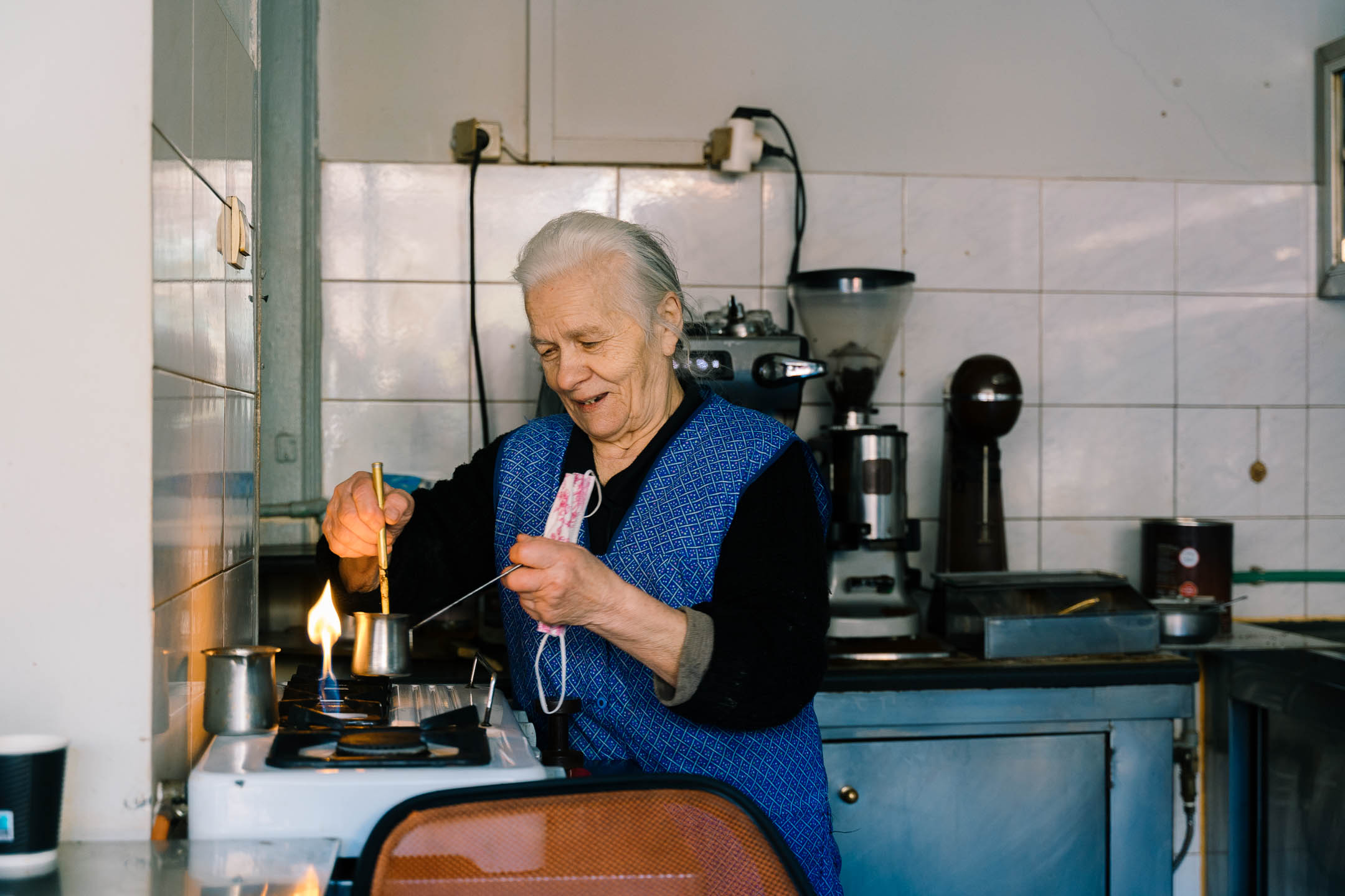 Upon arriving to Ioannina this time, we decided to cross through its heart and head towards the network of pedestrian streets. It’s Saturday afternoon, and there’s a lot of traffic in town. We leave our car and walk to Pargis square. There, in front of Agios Georgios church, we feel the neighbourhood’s vibe, that attracts young crowds, university students from all over Greece. The beautiful cafés on the square are buzzing with activity, and we’re lucky it’s a sunny day. Across the square, for many decades, Mrs Niki has been running her coffee shop. We stop by for a Greek coffee, and even though we don’t order one, Mrs Niki also makes us her classic sandwich, with the fried meatballs.
