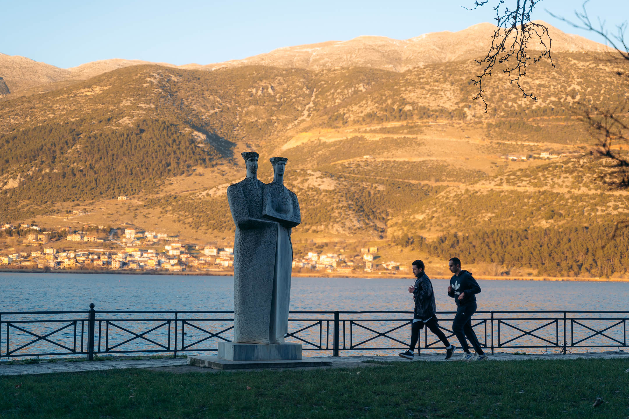 We explore the lake area the next day, starting at the hotel we’re staying in, Hotel du Lac, by the lake. It’s almost nine in the morning and from the hotel’s balcony we see the calm lake as a small boat crosses it. It stops somewhere in the middle of the lake, and the fishers start fishing. The water is almost still, some birds are flying over the lake, occasionally diving in its waters. I go to breakfast and immediately after, we take bikes from the hotel and start our lakeside ride. Some people are on their morning walk or run, others are walking their dogs. We notice the sculptures around the area and “The couple” by sculptor Papagiannis, placed “right across the castle’s terrible dungeons” stands out.