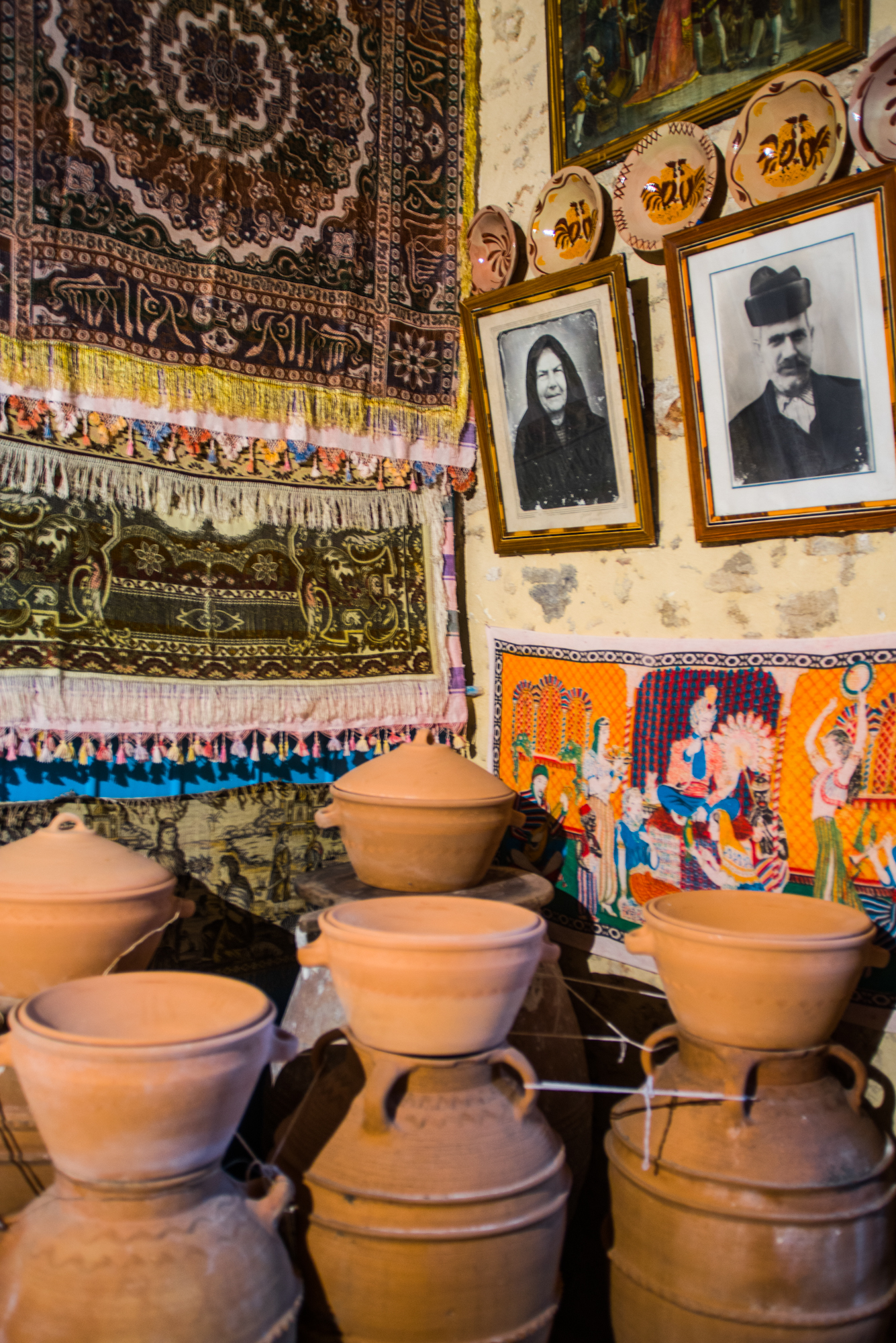 You can read the date it was built, 1902, on the entrance’s floor in the typical mosaic of white and black pebbles. This mosaic style, that is called ‘chochlakia’, from the round pebbles it consists of, decorates houses, yards and squares all over Rhodes and the artisans from Apollona village were the most sought after. The typical vaulted arch, in the middle of the heigh ceiling, dominates the large room and apart from adding to the beauty of the room it also adds to the safety of the structure. But, what really captures the eyes in what’s called ‘Mesa Hora’ (Inner Country), the part of the room towards the interior of the house, is the wall right across the entrance; the famous ‘Stolisia’ (decoration). The numerous ceramic plates on the wall, mostly with nature scenes on them but also with stills of the island’s history, that showed one’s position in the local community. The family photos that were placed in large frames with silk embroidery are also a typical decoration of the home.