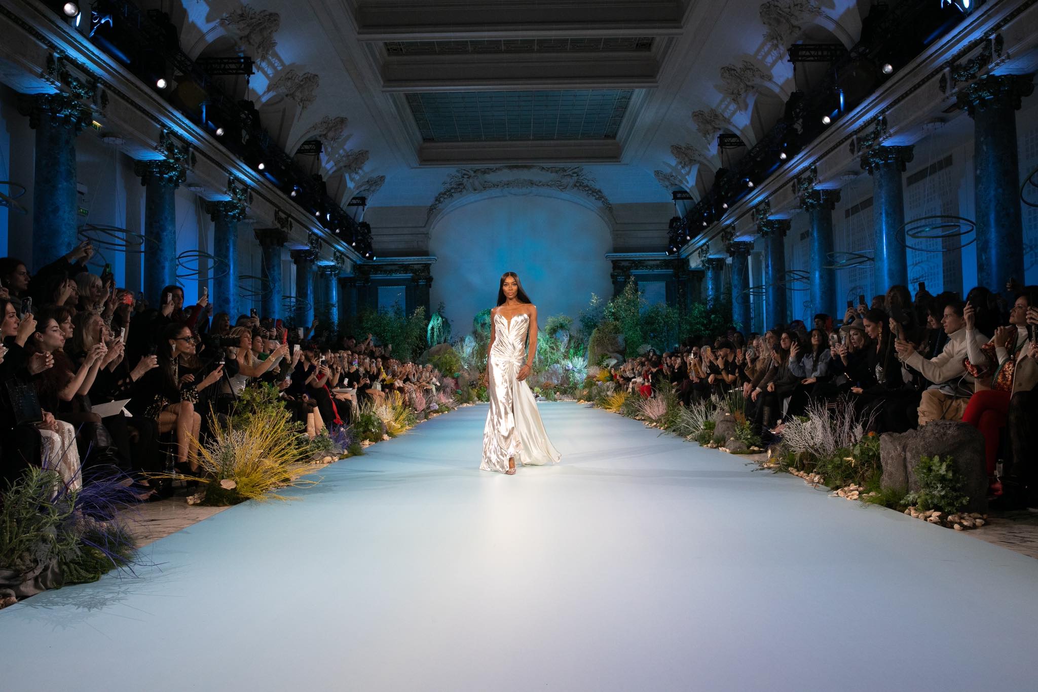 The collections are rooted in eveningwear and sharply defined silhouettes, with a consistent emphasis on the female form through fitted bodices, clean waistlines, and controlled volume. Since launching his label in two thousand eight, the designer has built a recognisable aesthetic through dresses and jumpsuits that rely on cut and fabric choice rather than surface excess. Satin gowns with wrapped constructions, structured bustier dresses, and wide-leg jumpsuits appear season after season as core propositions. Parallel to the label’s retail presence, his visibility as a television judge has placed the work firmly in the public eye, creating a rare overlap between fashion production and mass cultural recognition in Greece.