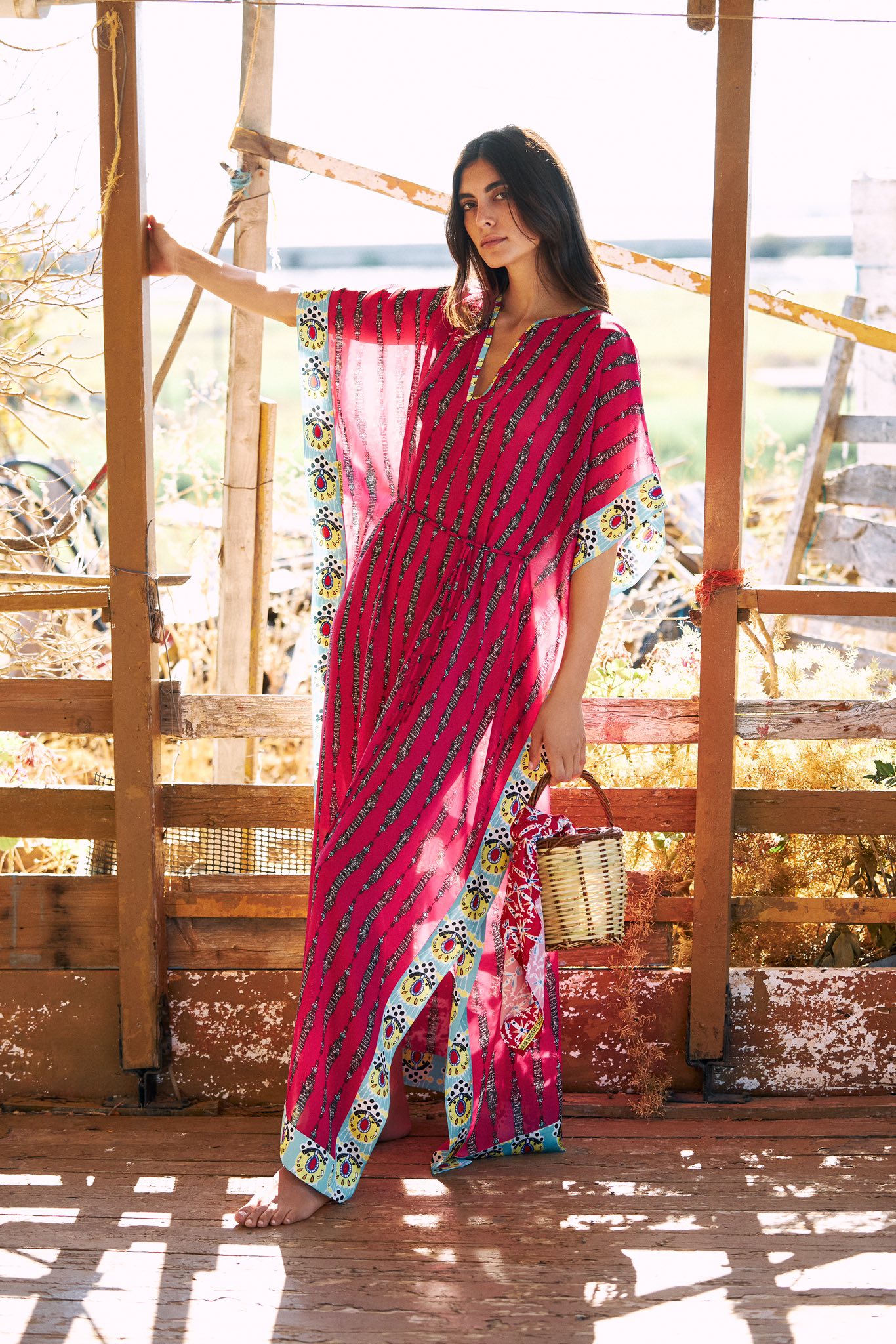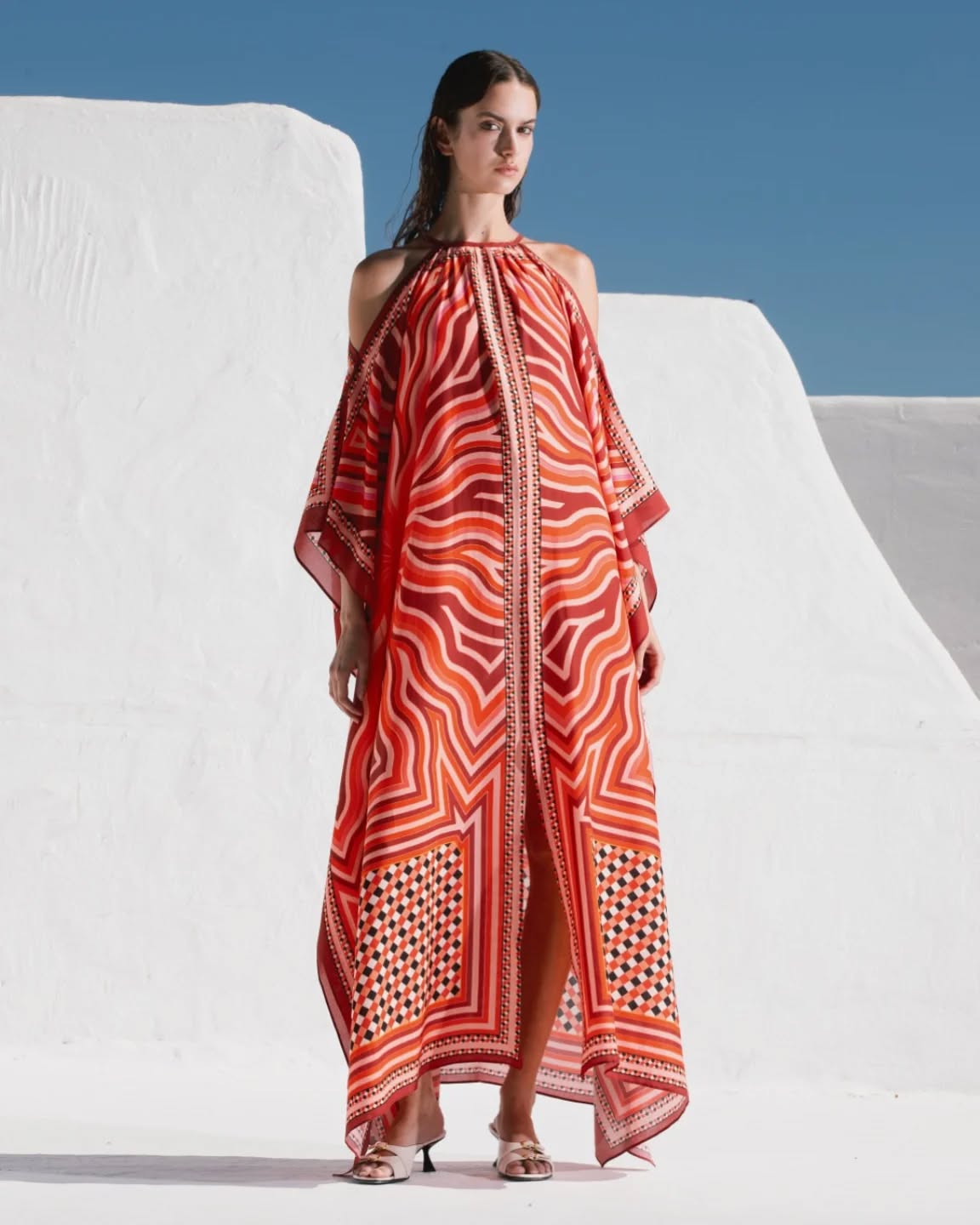 Resortwear from this label is defined by bold pattern, color, and decorative surface. Dresses, kaftans, and statement pieces dominate the offer, intended for high-visibility summer settings. Fabrics range from silks to cotton blends. The brand sells online, through international luxury retailers, and maintains a strong presence in Athens.