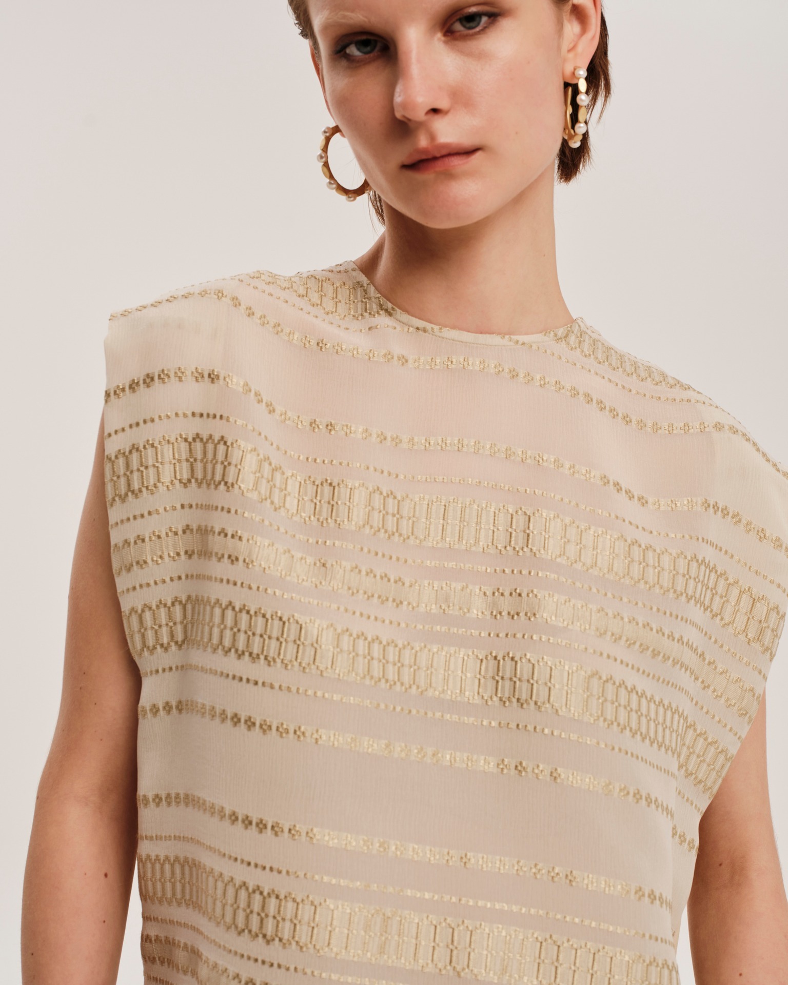 Resort and summer collections draw heavily on Greek textile heritage and artisanal production. Garments include dresses, tunics, kaftans, and lightweight separates, often featuring woven or embroidered fabrics. Natural materials such as cotton, silk, and linen are central. The brand operates its own boutiques, sells online, and has a strong retail footprint in Athens as well as international luxury stores.
