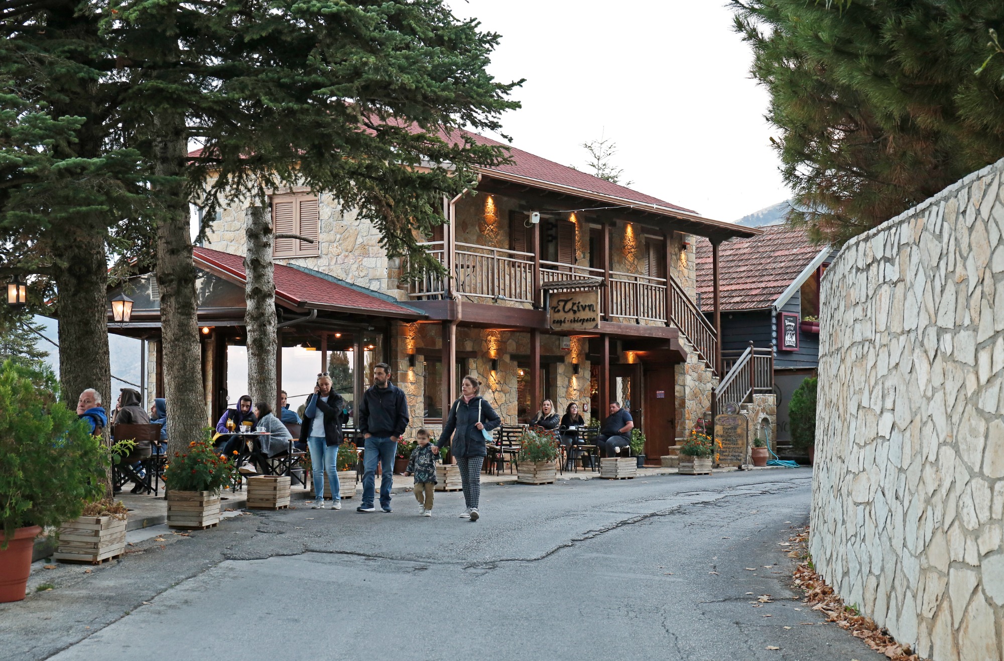 Mesaia (Middle) Trikala is the liveliest and most frequented part of the wider Trikala area. An assortment of cafes, as well as restaurants, tavernas, shops selling traditional products, as well as roving merchants selling fruit, nuts and honey may be found here. The popularity of Mesaia Trikala on weekends and public holidays can even lead to parking space challenges. We carried on walking for Ano (Upper) Trikala, which did not take long to reach. It is included on the agenda by many visitors. Seeing trekkers with hiking staffs, special footwear and backpacks is a common sight here. The route tells the region’s history. Derelict houses, shops with wooden verandas hanging by the road, vegetated slopes, water sources and taps with drinking water, Agios Gerasimos church, as well as the Theofilia hotel – or whatever is left of it following glory days, primarily in the 50s, its guests back then including Egyptian King Faruk I – are all part of the setting. This hotel’s exterior remains in solid, fine condition but there is nothing left of the interior.