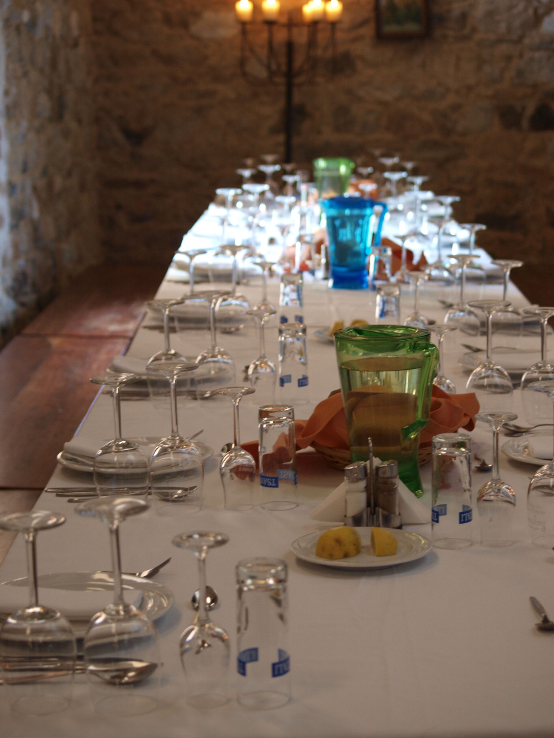 After treating us, he led us to the dormitories we would be staying in, rooms for 5, 8 or 10 people with shared toilets and one shower. The beds were already made, and the sheets appeared clean. We attended vespers, and immediately after we sat to dinner. We were led to the dining hall where we were seated at large monastery tables with the food already served: green beans, feta, homemade bread and wine.