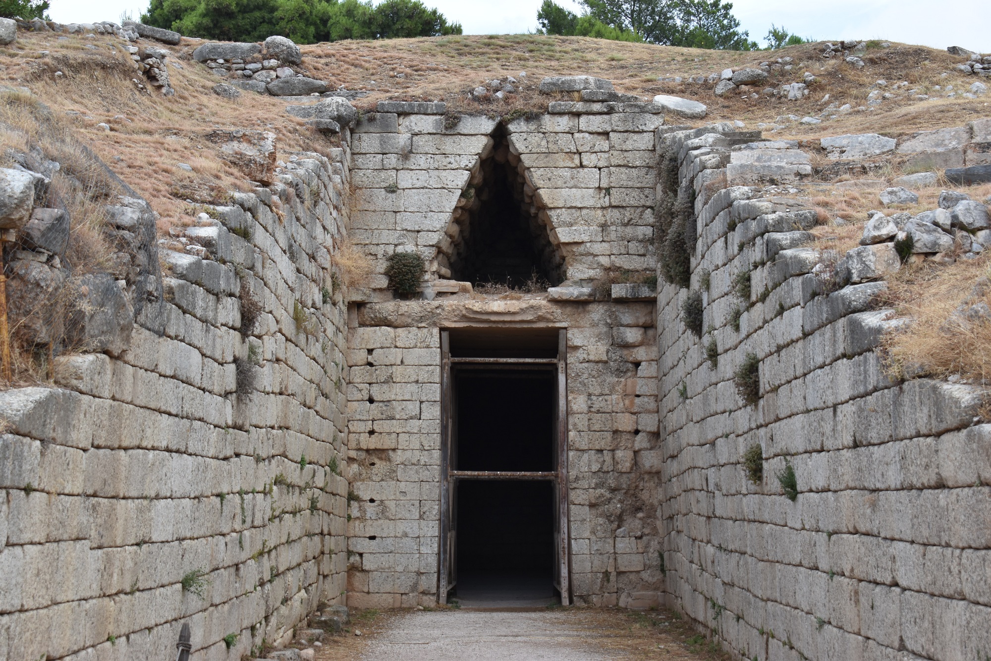 Then you’ll pass through the village of modern-day Mycenae and will have to go up to the entrance of the enclosed archaeological site. The hill on which the fortified acropolis of Mycenae stands is steep and not easy to climb, at 128m altitude, with bushy vegetation. You’ll feel awe when you face the Lion Gate – a unique megalithic monument – and the Cyclopean walls that surround the hill ( on average 5.50m thick) built with huge blocks of rock. Makes one wonder whether it was built by humans or semi-gods.
