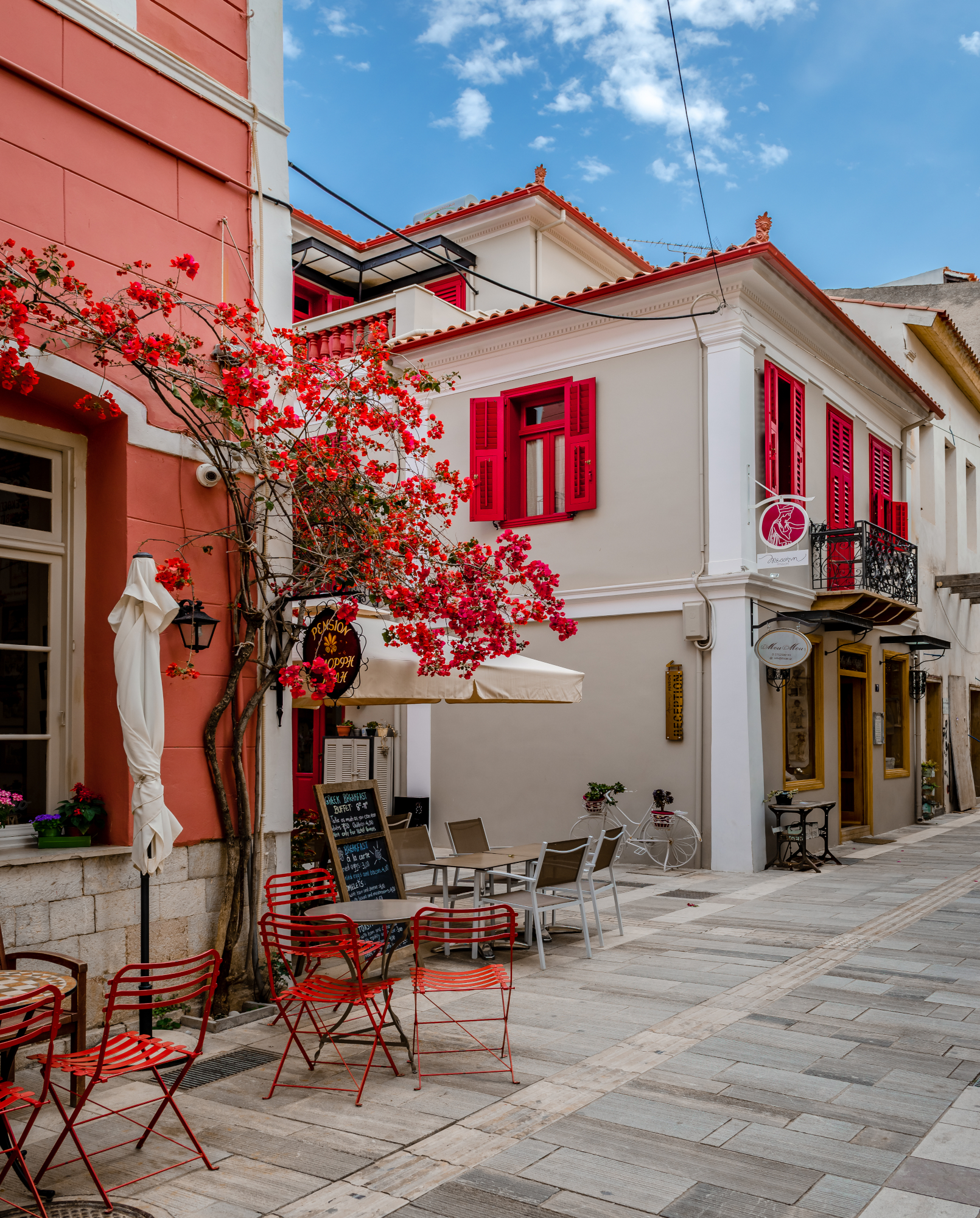 The unrivalled view got us in the mood to explore so we headed down to the town, where we spent considerable time strolling about its gorgeous alleys while enjoying the sun. We covered Syntagma Square, the city’s main square surrounded by historic buildings, as well as the esplanade, offering a view of the Bourtzi water castle, in the middle of Nafplio’s harbour, nearly 400 metres from the coast. An island-fortress, this monument is built on the islet Agioi Theodoroi. A first fortress was built in 1473. Additions and corrections ensued at various stages. The Greek government took refuge at the Bourtzi water castle twice following Greece’s liberation from Ottoman rule for protection when the nation fell into civil strife. Everyday life on Nafplio is special, the sea, fresh air, and charming sense of history being key parts of it.