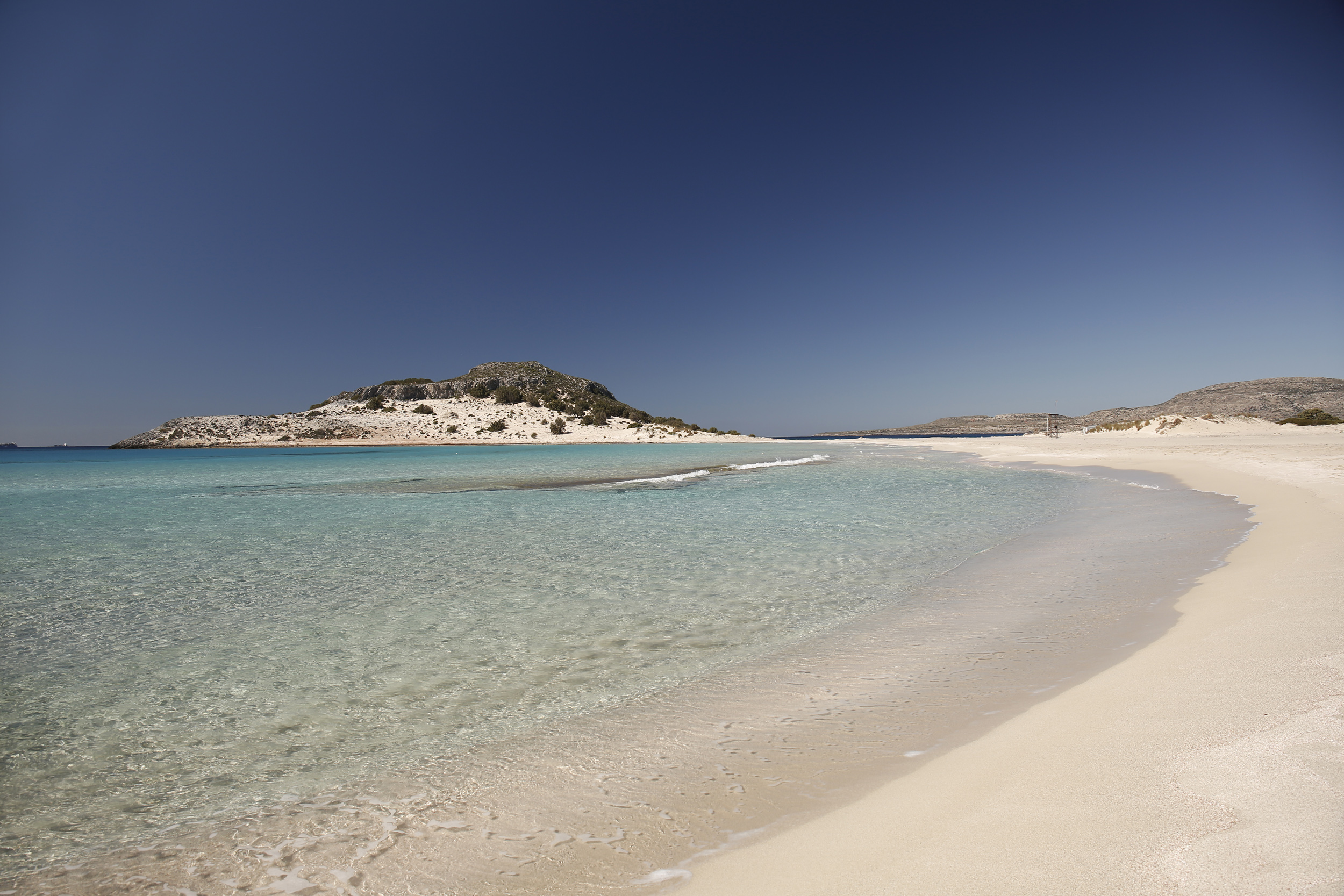 Famed for its electric aquamarine waters and vast sands, Simos is one of the most stunning beaches in all of Greece. Tiny shells and red coral tint the shallows pink. A narrow strip of sand separates two bays—Sarakiniko (the larger beach) and Fragos (the smaller). Towering dunes and a cedar forest complete the surreal, desert-meets-sea atmosphere. The beach may be named after a Kalymnian diver who drowned here—or possibly a solitary hermit who once lived nearby.