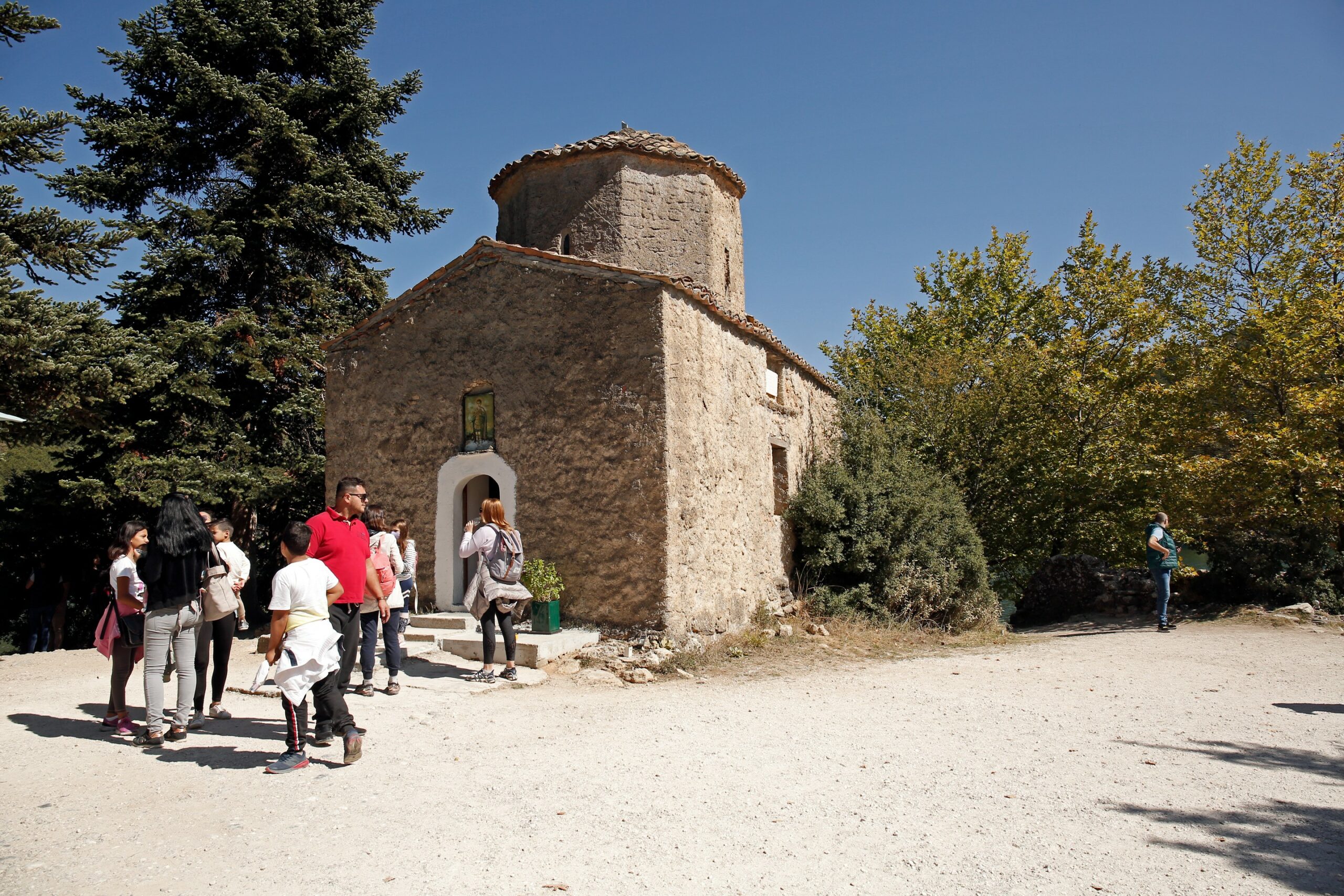 Ascending towards the monastery of Agios Georgios, on the slope above the lake and at an altitude of nearly 1,000 metres, large buses full of pilgrims slowly take the turns, reflecting the age we live in.