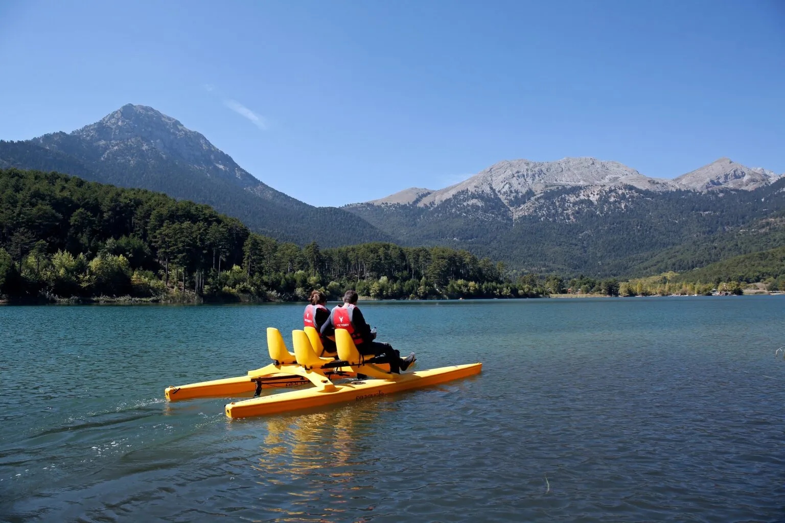 Cyclists pass by, horses offer themselves for short or longer equestrian rides, fancy yellow water bikes, (www.exploreziria.gr ) cross the emerald waters reflecting the towering fir trees on the opposite bank– the ultimate setting of a peaceful life.