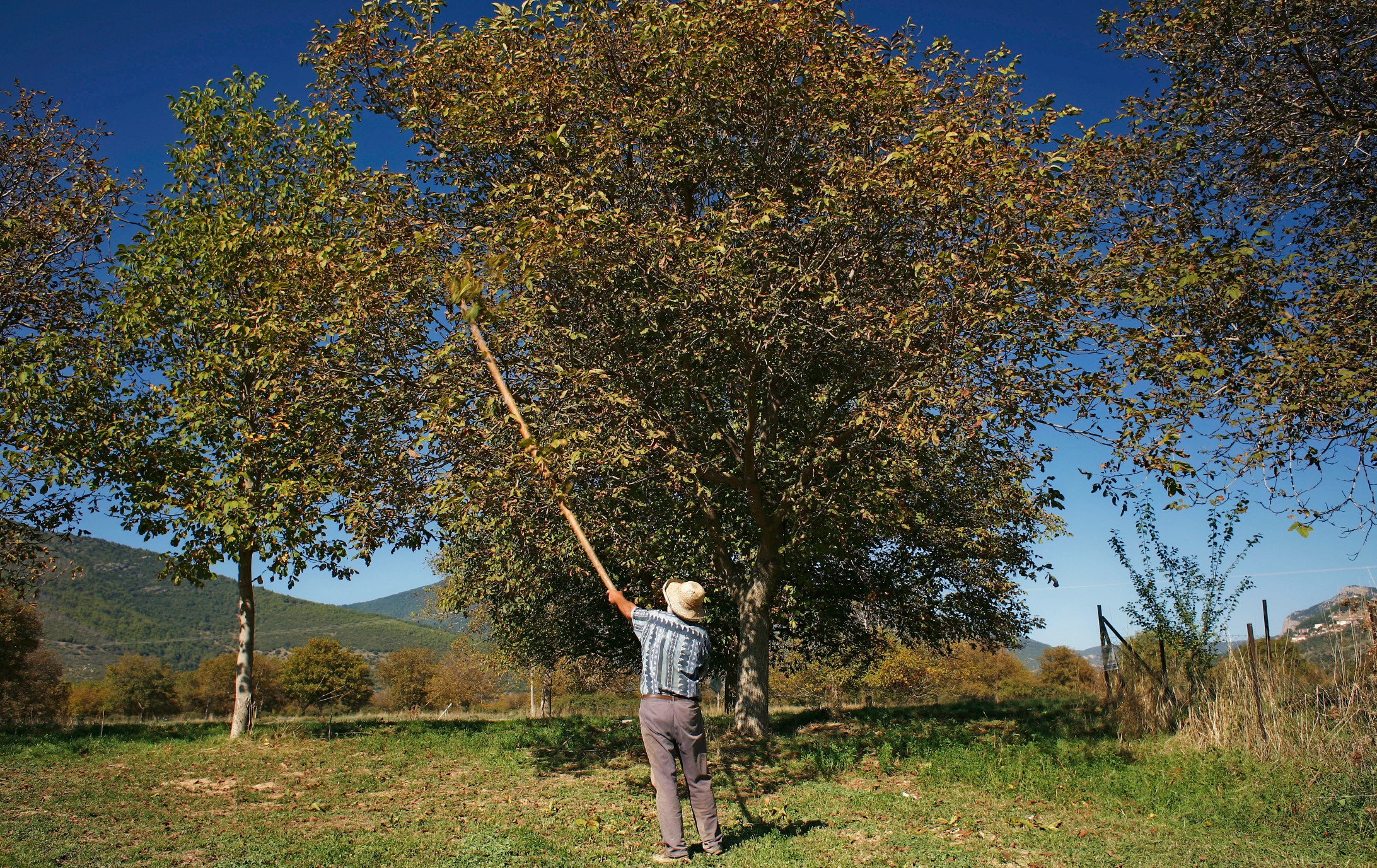 Just outside the village of Messino, at the outskirts of ancient Feneos, a farmer is vigorously whipping the sturdy walnut branches, dropping the precious fruits on the green, freshly watered ground. Soon, he will take a long walk under the shadows of these giant trees and collect them, filling and weighing his baskets, painting a picture of a process that has been repeated over and over again for thousands of years.