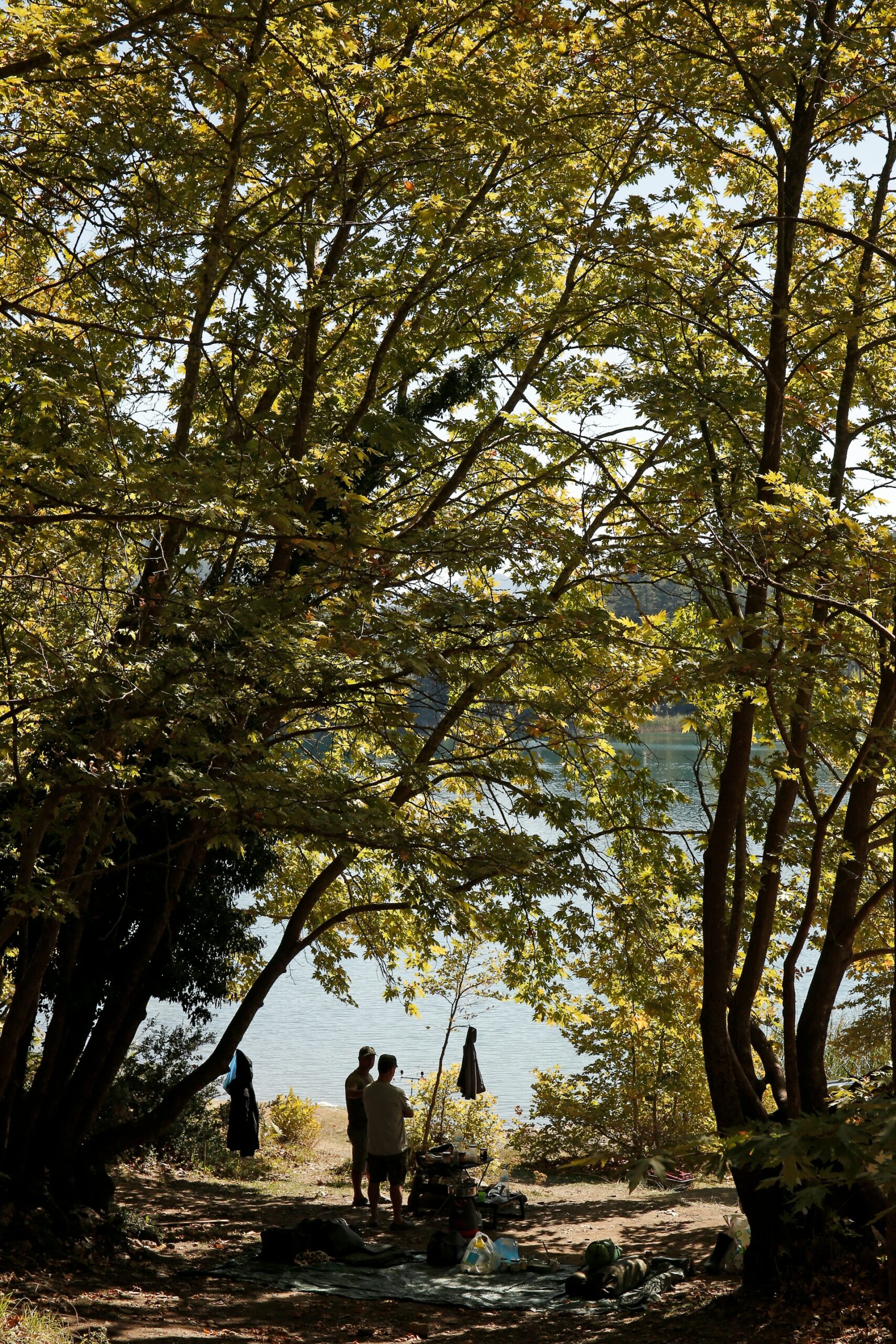 Finally the dirt road ends and another world appears in front of me. A world born from the imagination of the most elegant auteur. Its beauty is indescribable. Plane trees cover the peripheral paved road, painting with their shadows surrealistic shapes on the ground, almost reaching the lake shore. Colourful tablecloths are spread on the ground, the picnic is interrupted only by laughter. Makeshift swings made of thick rope complete this carefree scene.