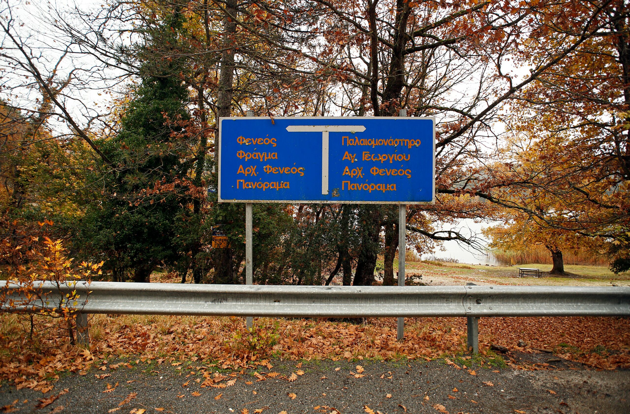 Heading south now, with Ziria on my left, I realize that I have reduced the speed of the car a lot. Yellow and orange autumn leaves sway on the tree branches near the village of Kato Tarsos, still holding on before the autumn breeze carries them to the ground, starting a new cycle of life. With the dark blue sky as a background, the entire image seems to have sprung from the imagination of a painter, a lover of excess and intense contrasts.