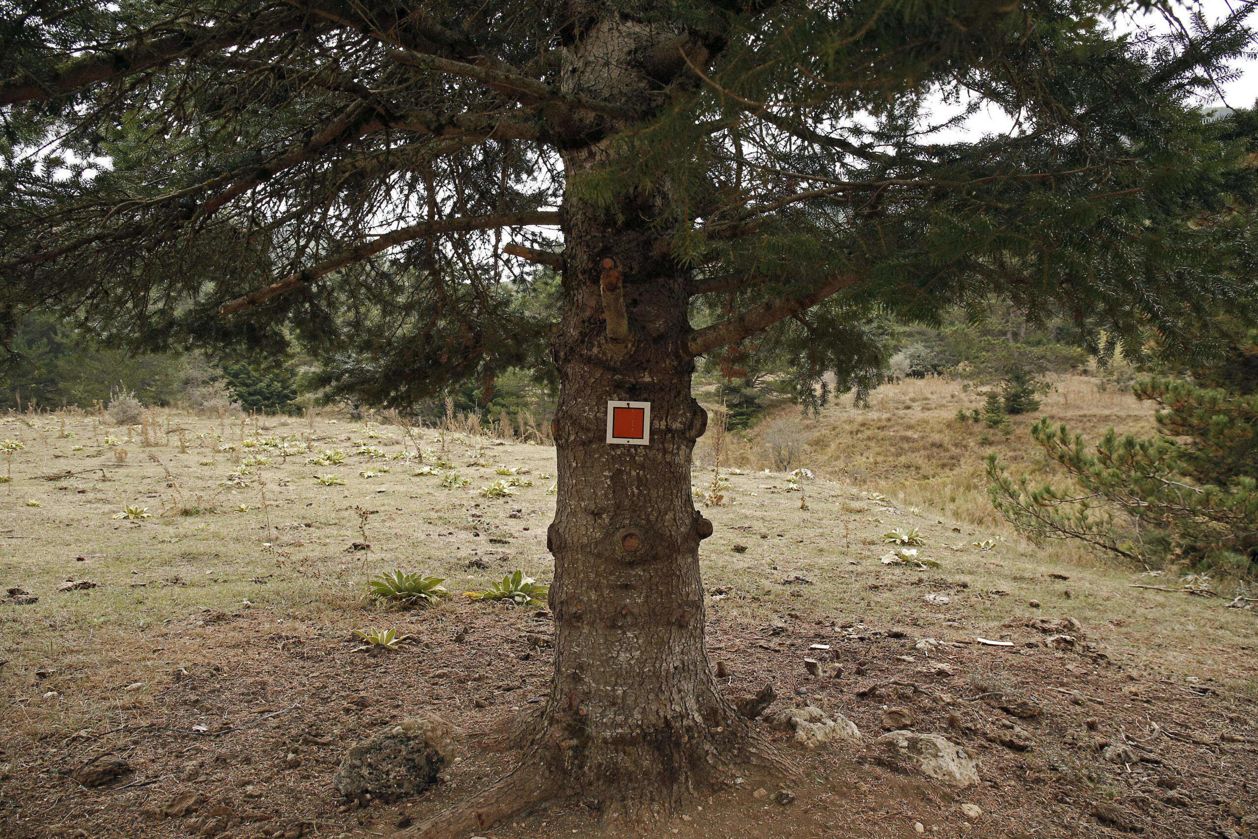 It did not take long for us to reach the first stop of this friendly tour, at a clearing, a small valley devoid of vegetation, except for a single tree at its centre that was marked with a small red square sign, indicating the path of a mapped trail.