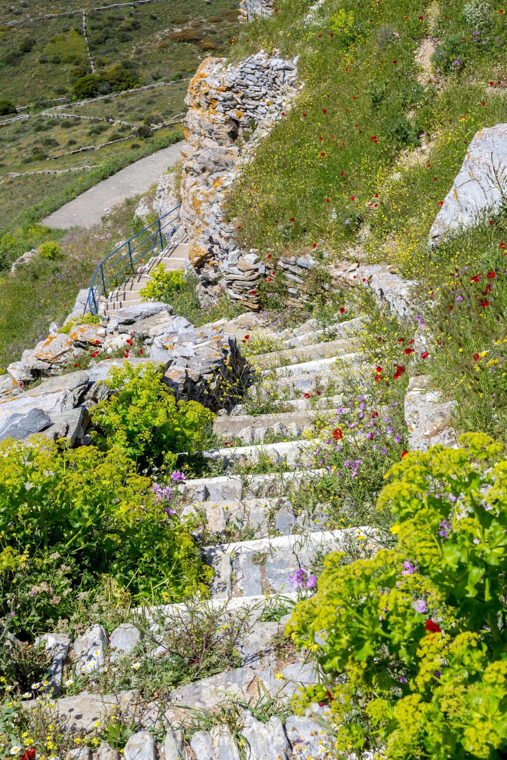 This track turns into the old path that descends into a small river with the water mills and a stone bridge. After crossing the bridge, go up the track until you cross a dirt road. Crossing over, continue straight ahead along the typical Andriot path sheltered between two dry stones walls. About 300 m further on, after some cisterns the path forks. To the left (north-eastern) the track leads up to the old Venetian castle of Faneromeni, at an altitude of 585 m. The right fork leads you into Kohilou, a white-washed mountainside village, huddled under the castle, where spring water flows in abundance and the views of southern Andros, Tinos and the deep blue of the Aegean impress. After leaving the village, the well signposted pathway descends gently towards the bay of Korthi.