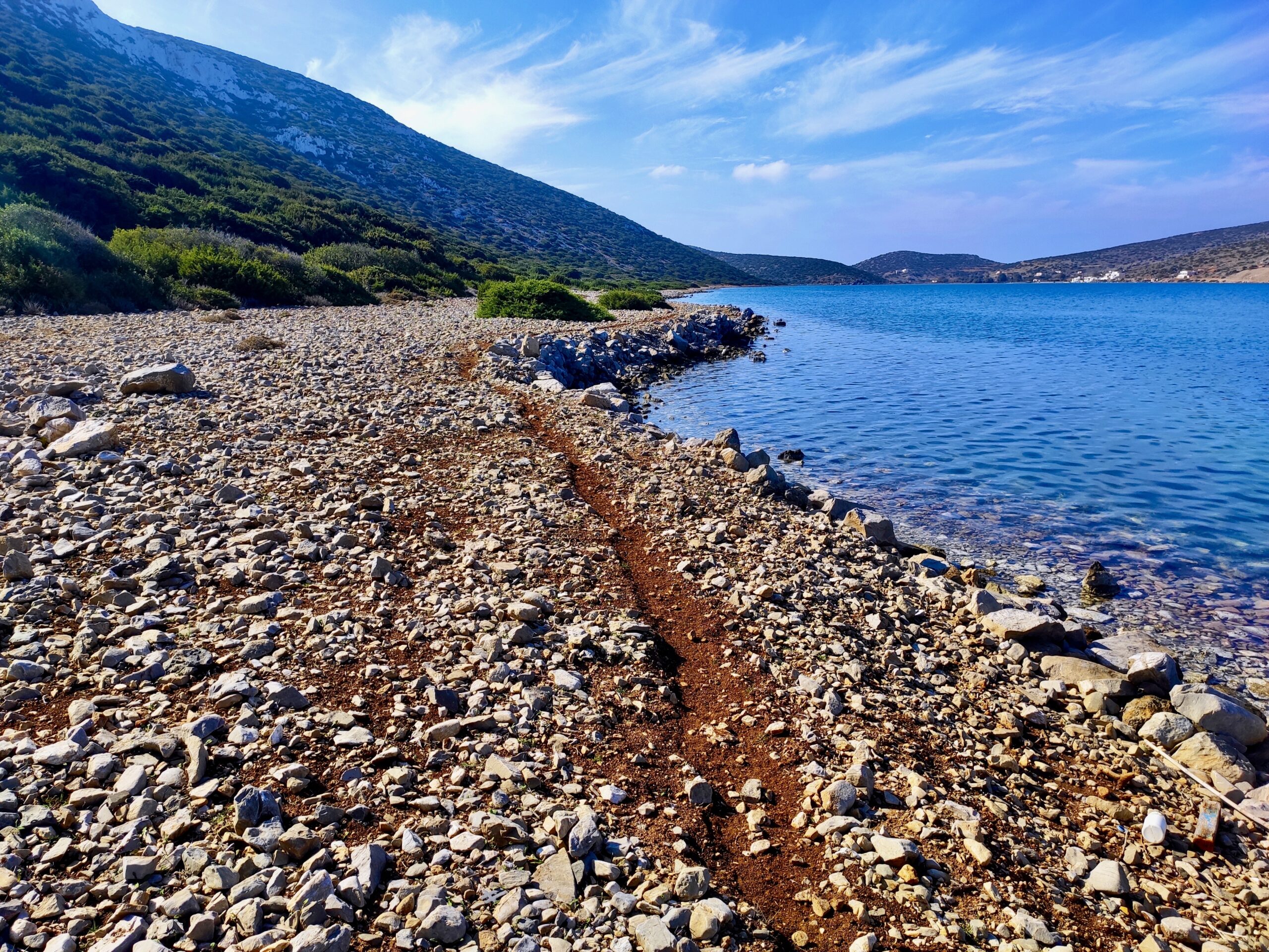 This hike starts about 120m south of the chapel of Agios Panteleimonas, at the location of a fold. You have to cross the field right next to fold and follow the dirt road that goes down to the creek. After about 180m, right at the creek, the dirt road goes uphill on the opposite slope, but you’ll have to get off the dirt road, into the creek and head north. From here, you can choose the easiest path, either on the creek’s bed or on one of the animal paths on both sides of the creek, until you reach the sea. The first beach you’ll come across is Lantes, and right next to it, on the west, is the beach Panormos where you’ll also find the gorgeous Byzantine chapel of Agios Nikolaos.