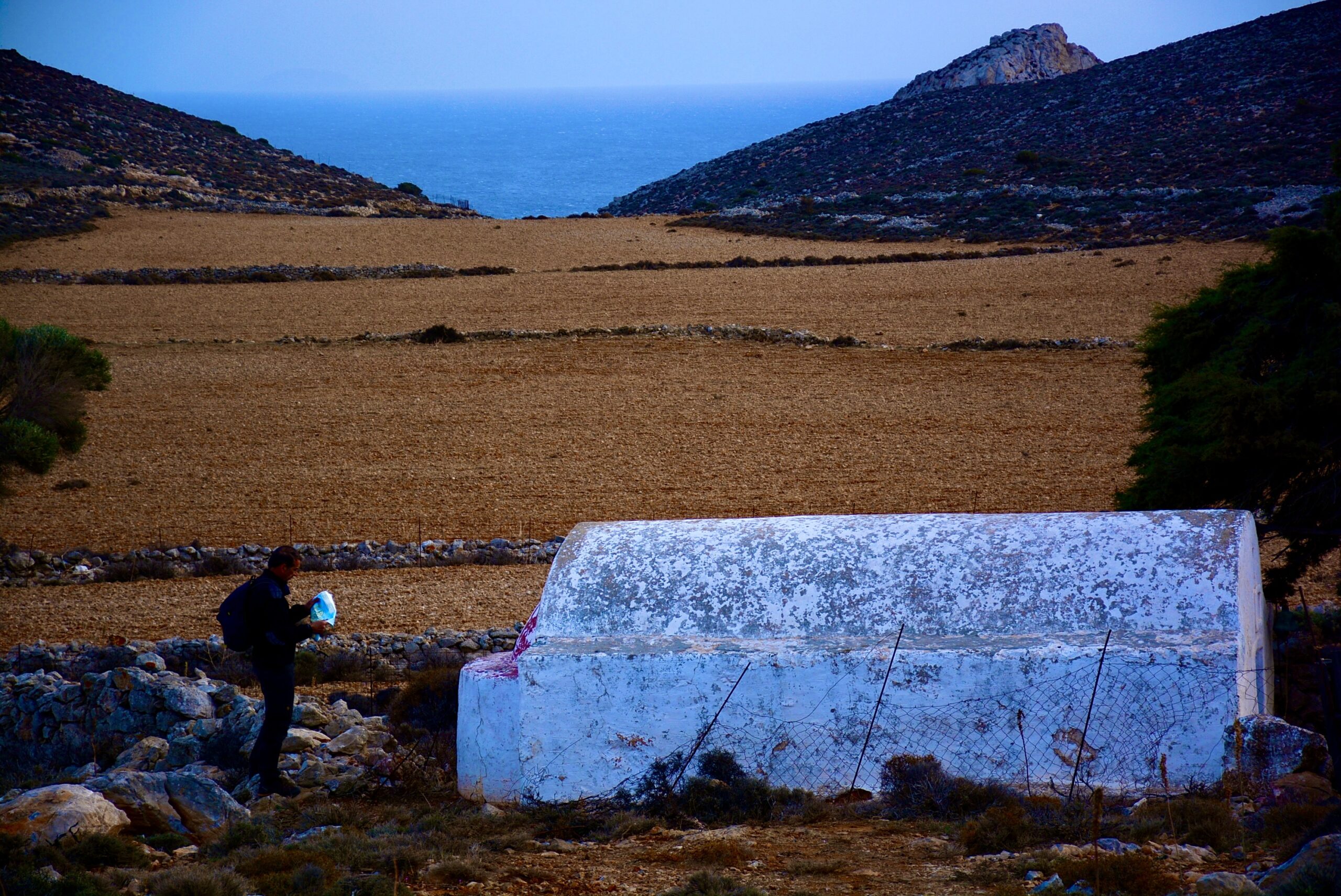 Take your vehicle to the beach of Agios Konstantinos and start your hike on the path that starts right next to the last house, about 100m from the beach. The path goes south, along the coast, and there are some small pebbled beaches called Lantes. The largest and most beautiful among them is the southernmost one, the 3rd Lanta, about 900m from the hike’s starting point. Continuing southbound, you’ll go up the slope, and, after 1.5km (from the starting point) you’ll reach the post-Byzantine chapel of Agios Savas. At this corner of the island, there used to be large older buildings, of which only the stone enclosures remain, as well as the ruins of many farmhouses. There is no clear path from Agios Savas, but there are many animal paths that go up towards the top of Ehili, that can be seen in the southwest. Go up the norther slope of Ehili, until you reach the old farms with the stone enclosures, and from there head west on the destroyed farm road (basically wheel tracks on the weeds) that crosses those farms. A bit further down the road, you’ll walk between the ruins of an abandoned farm village and, on your left, you’ll see a large field and the post-Byzantine chapel of Panagia Amorgiani with the large pine next to it, the only tree on this rocky corner of the island. From there, go down the bumpy farm road northbound, and about 600m after Panagia Amorgiani, you’ll have reached the main road of Agios Konstantinos, where you turn right (east) to return to the starting point and complete this route.