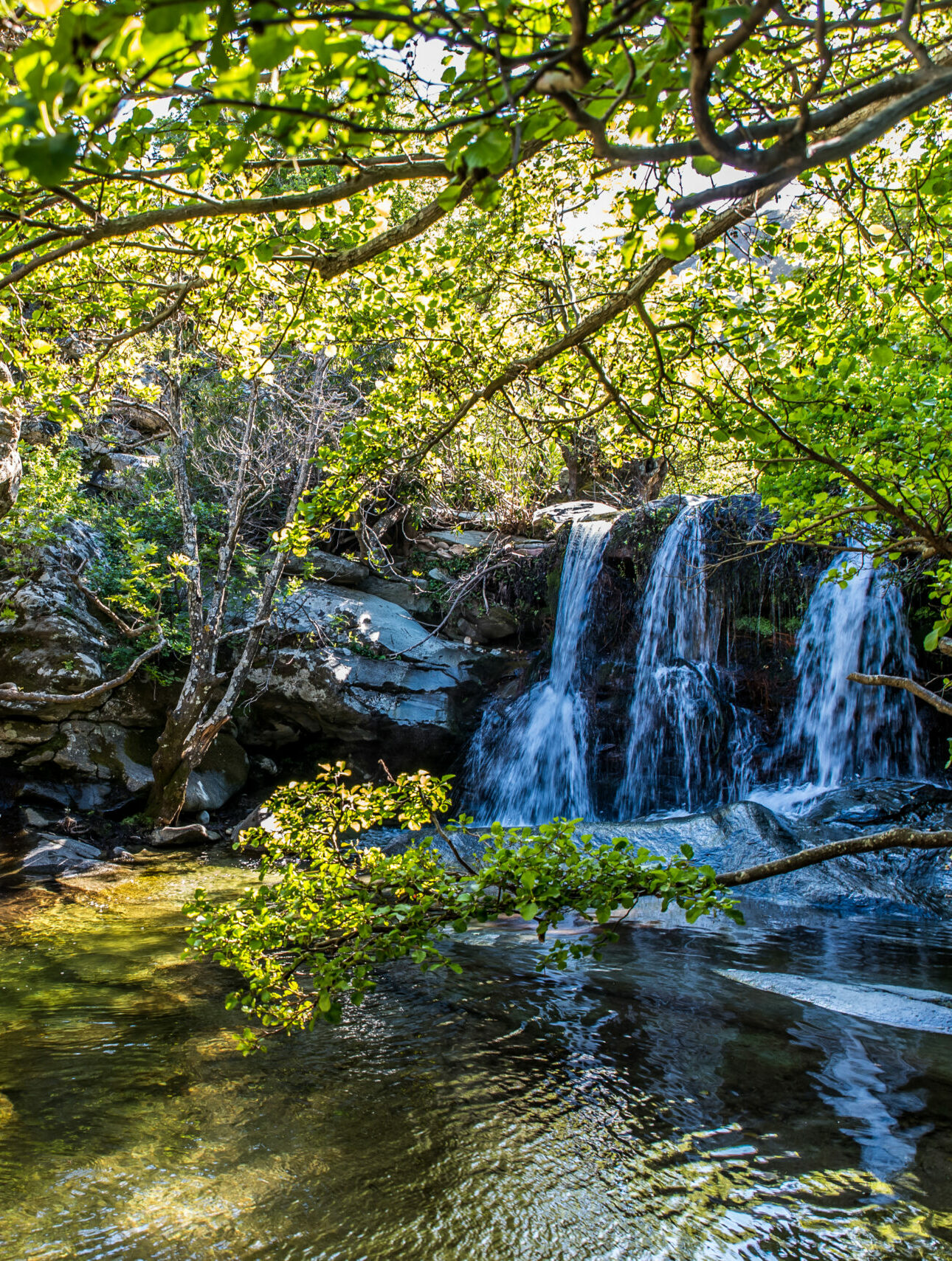 This hike begins on the dirt road after Panahrantou Monastery (aka Agios Pantelemonas), next to a spring. The path is well marked and very pretty and descends towards Messaria. Almost all of the ‘calderimi’ is paved with large stone slabs and it snakes its way to village Mesaria from the monastery. The path crosses the river over the bridge of Haikuomeni and eventually ends at the main road at the approach of Mesaria. At a junction, just before you leave the main road, on your left you’ll spot a dilapidated and crumbling old Tower (The tower of Kairis). Following the signposting, pass through the houses to continue onto the second leg. Walk besides irrigation ditches tinkling with clear spring water and stone-terraced fields upwards to Menites. As you progress the path starts to follow the course of the river and the vegetation becomes dense and jungle like with plain and oak trees offering welcome shade. Hiking up the final stretch on this path, past old farmhouses, water running to your left and right, the sun breaking through the thick canopy of leaves, is like walking through a valley conjured in books of fairy tales.