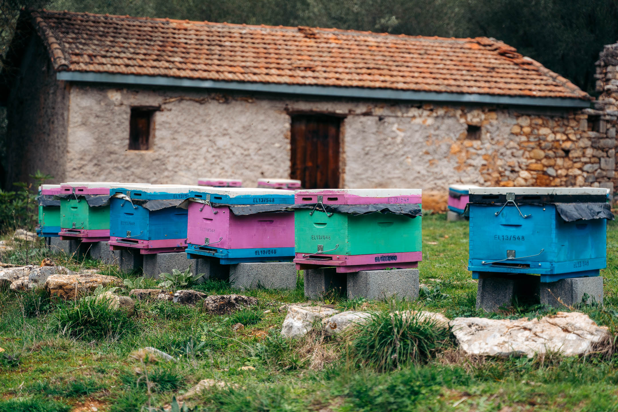 “These hives belong to my son, Dimitris” he says as we observe from a safe distance the colourful hives that produce Korys organic honey.
