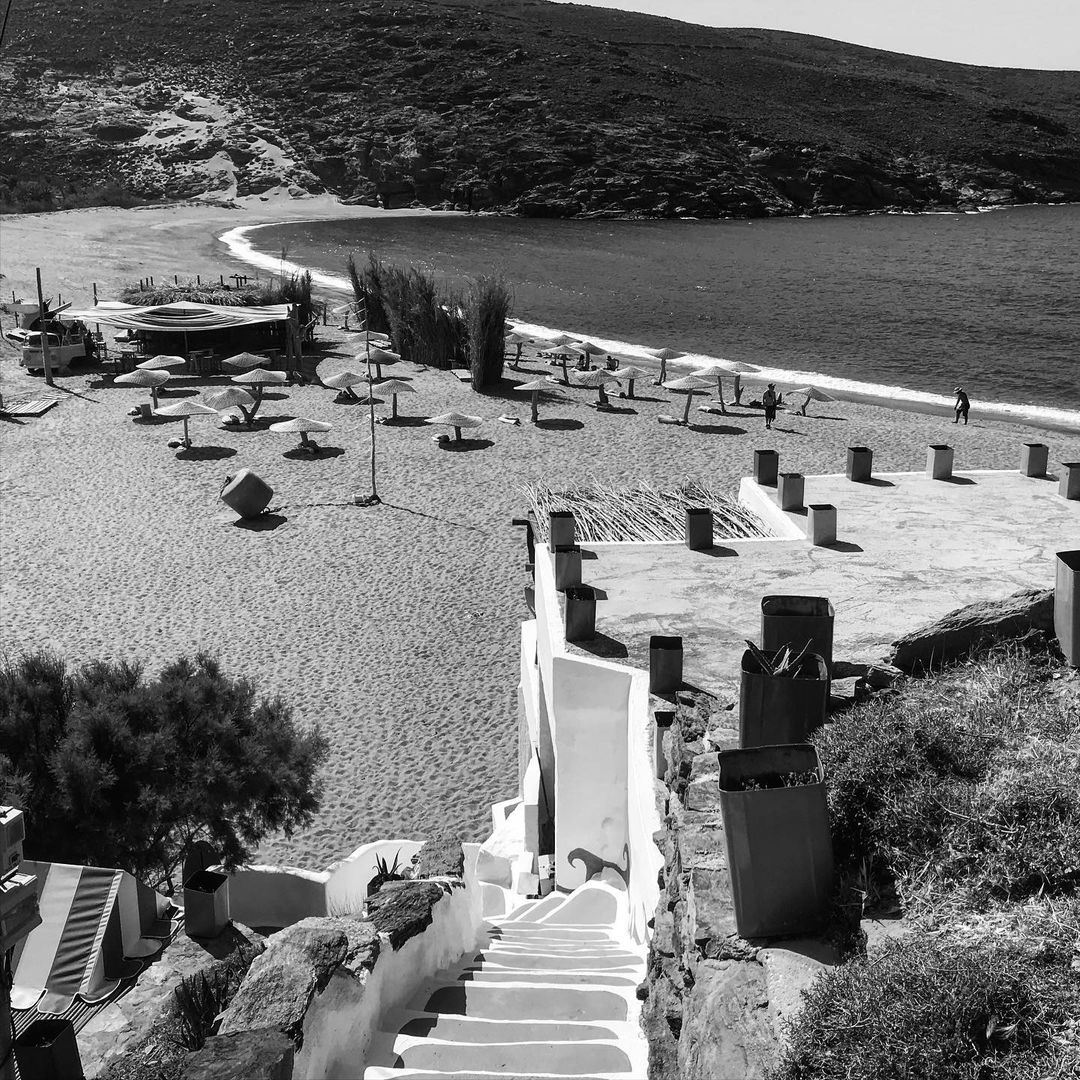 Well, for food, the island is a gastronomic destination, as anticipated and clichéd as this may now sound, so it’s difficult to pick specific spots. Even so, I do recommend the traditional taverna at Dyo Horia with an amazing view of the Aegean; the small eatery at Triantaros, for its meatballs prepared by Mrs. Eleni; Mikro Karavi in Hora, the main town, for its serene courtyard garden, eclectic menu and overall politeness; as well as San t’Alati at Agios Fokas beach. In the Exo Meri area, at Pyrgos, I recommend the exceptional pizza and pasta restaurant Dough & Shaker, and Marina at Panormos, for fish by the old pier. I also recommend Thalassaki, at Isternia beach, no longer a surprise tip but always a pleasure for tasting the high-flying offerings of its artistic chef Antonia Zarpa.