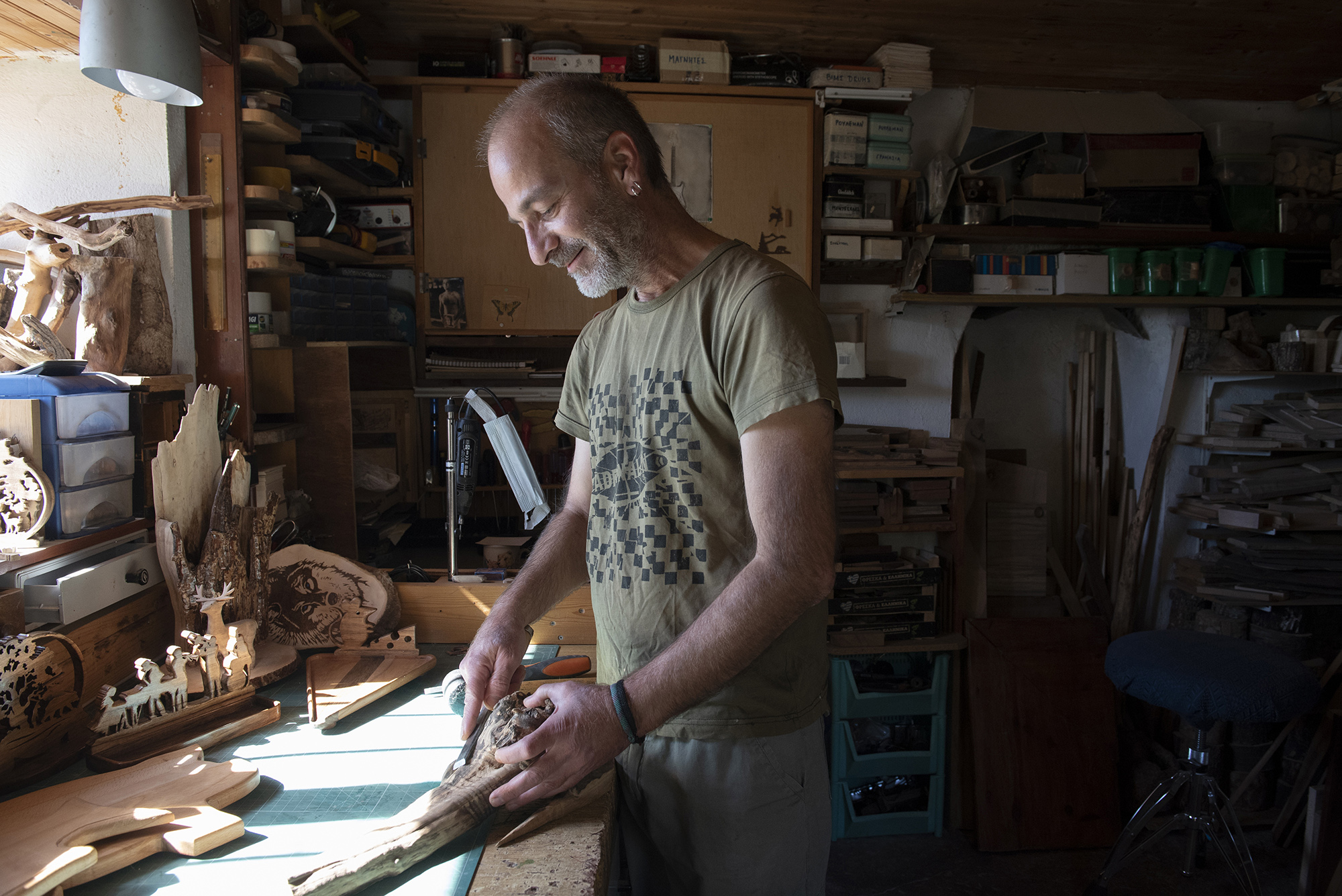 The workshop’s workbench, and the rest of the space in general, is full of various tools Giannis uses to shape the wood. He started off as a musician, having played guitar for many years and he studied sound engineering. “In the winter od 2013 we decided with Ioulia to come live in the village. Her father’s, her grandmother’s actually, house needed some work done, which we took care of. We like life in Tsepelovo. It has what we were looking for, calm and time for yourself and your balance,” Giannis tells us and adds: “Before we came here I’d learned how to make wooden musical instruments. I used this knowledge and started making both functional objects and decorative sculptures.”
