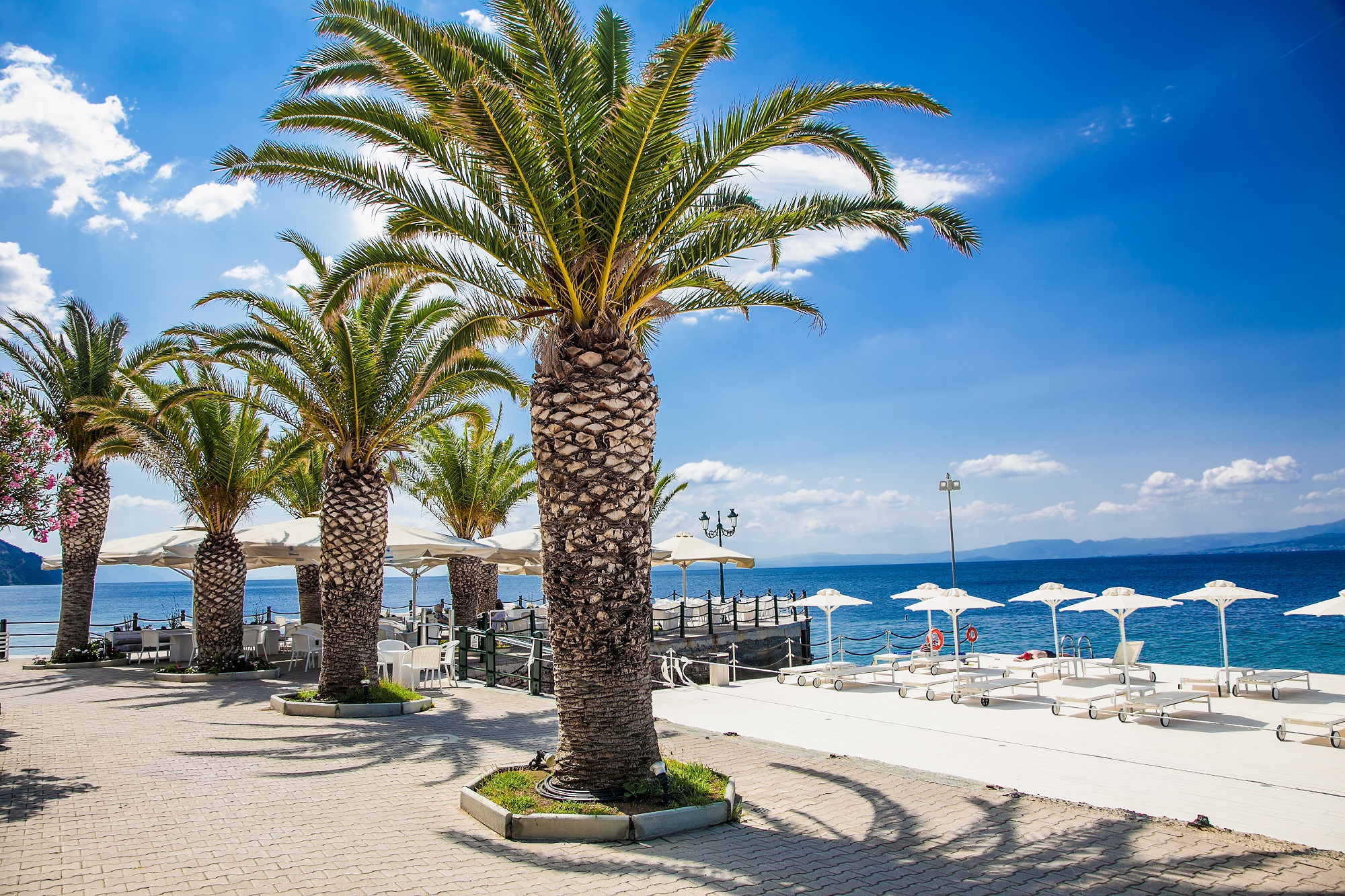 The lovely pedestrian seafront promenade with the palm trees encapsulates life in Aidipsos. / Photo: Shutterstock