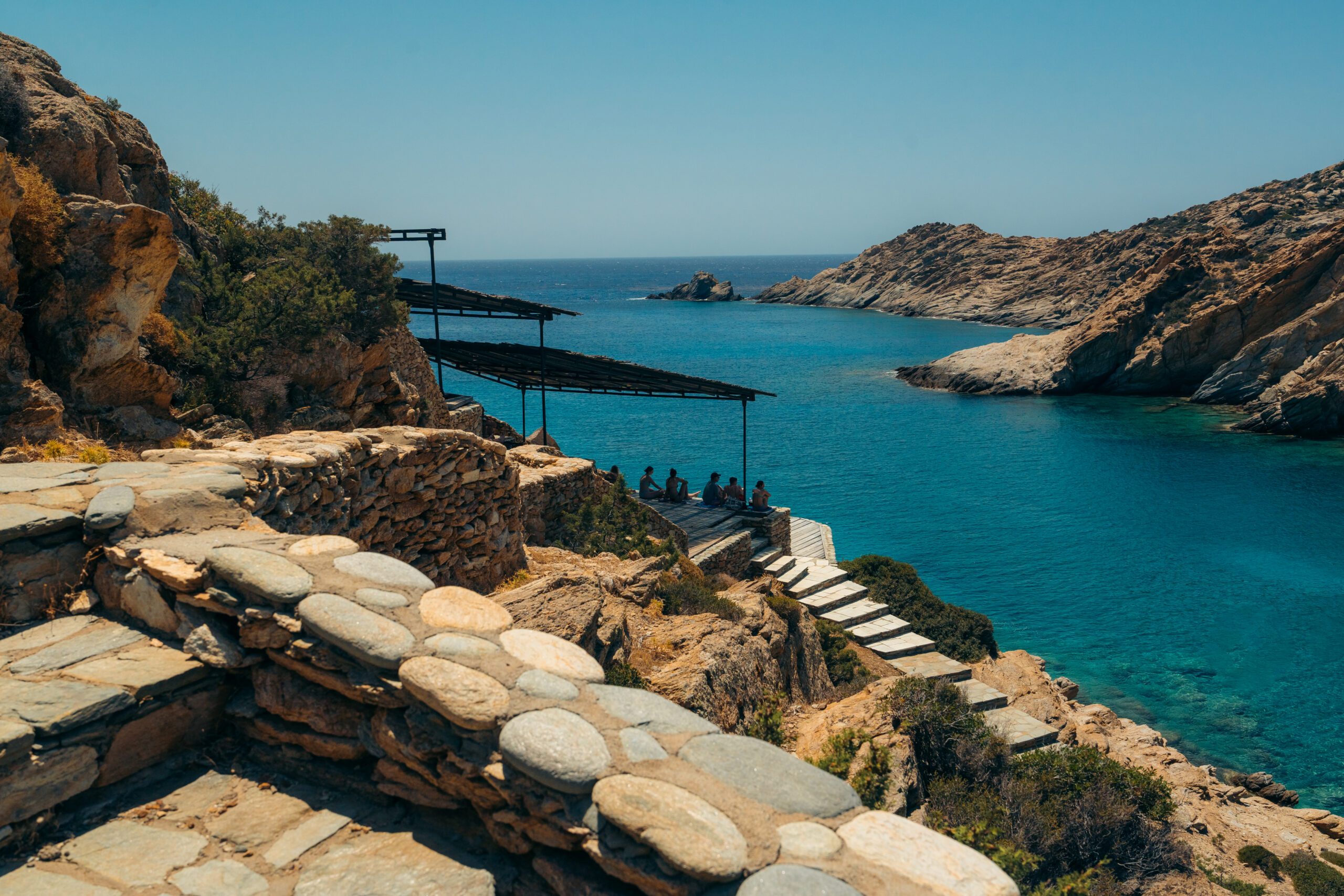 Over the years it has grown into a small settlement, consisting mainly of houses and apartments for rent, a hotel, campsites, ethnic restaurants, traditional tavernas, cafés and a shop. The beach bars of Mylopotas are considered to be the best on the island. The beach service is top notch with sun beds and comfortable loungers where everything is served from coffee, dishes from various world cuisines, cocktails, and drinks. There are water sports and diving facilities, and boats of all types can be rented. Tour boats also depart from here to less crowded beaches such as Tripiti, Pikri Nero, Klima, Manousou and Sapounochoma. In June, Mylopotas hosts the Panhellenic Beach Volleyball Championship IOS Major. It is only two kilometers from Hora, so many visitors walk there.