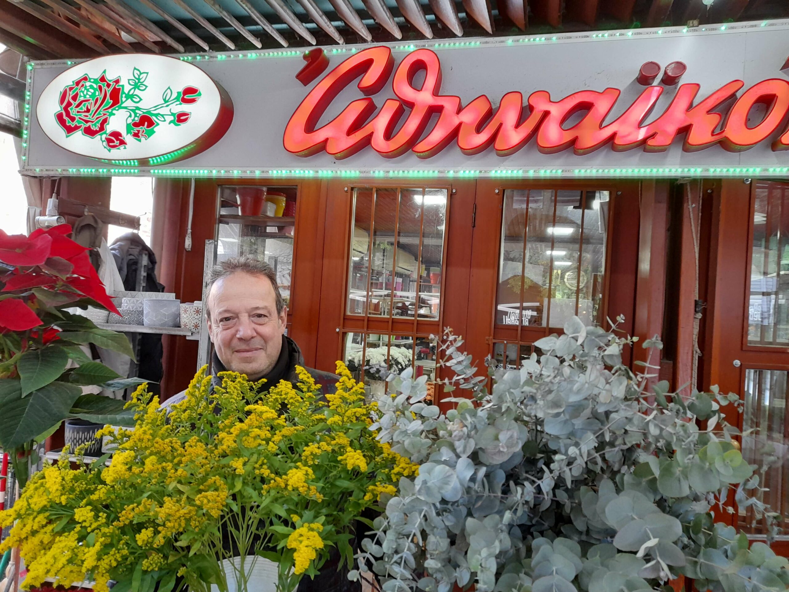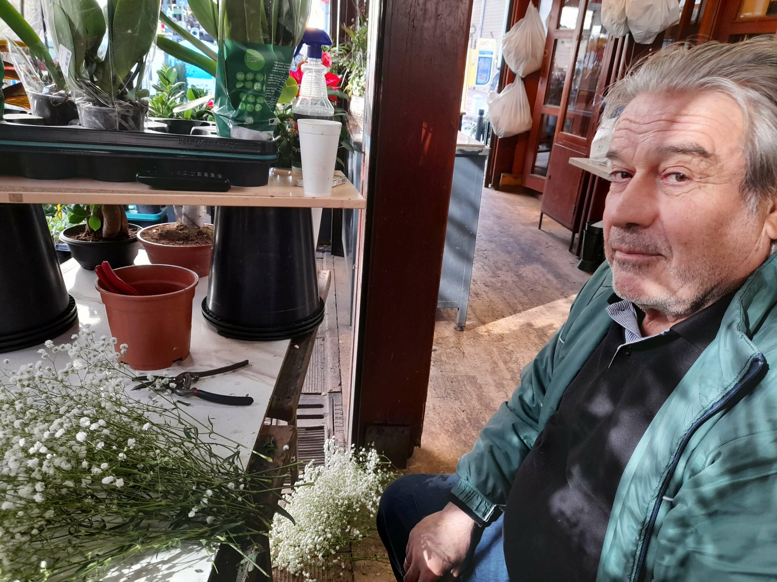 She spent her whole life among flowers, and she tells us about her daughter who set up a nursery only for potted flowers in Korinthos with joy and pride. Mr Kostas from the flower shop “Christos” is making a holly bouquet and talks about the past glory of the flower shops. While he takes care of some fresh dahlias in a pot, he smiles as he tells us that many romances have started with one of his bouquets.