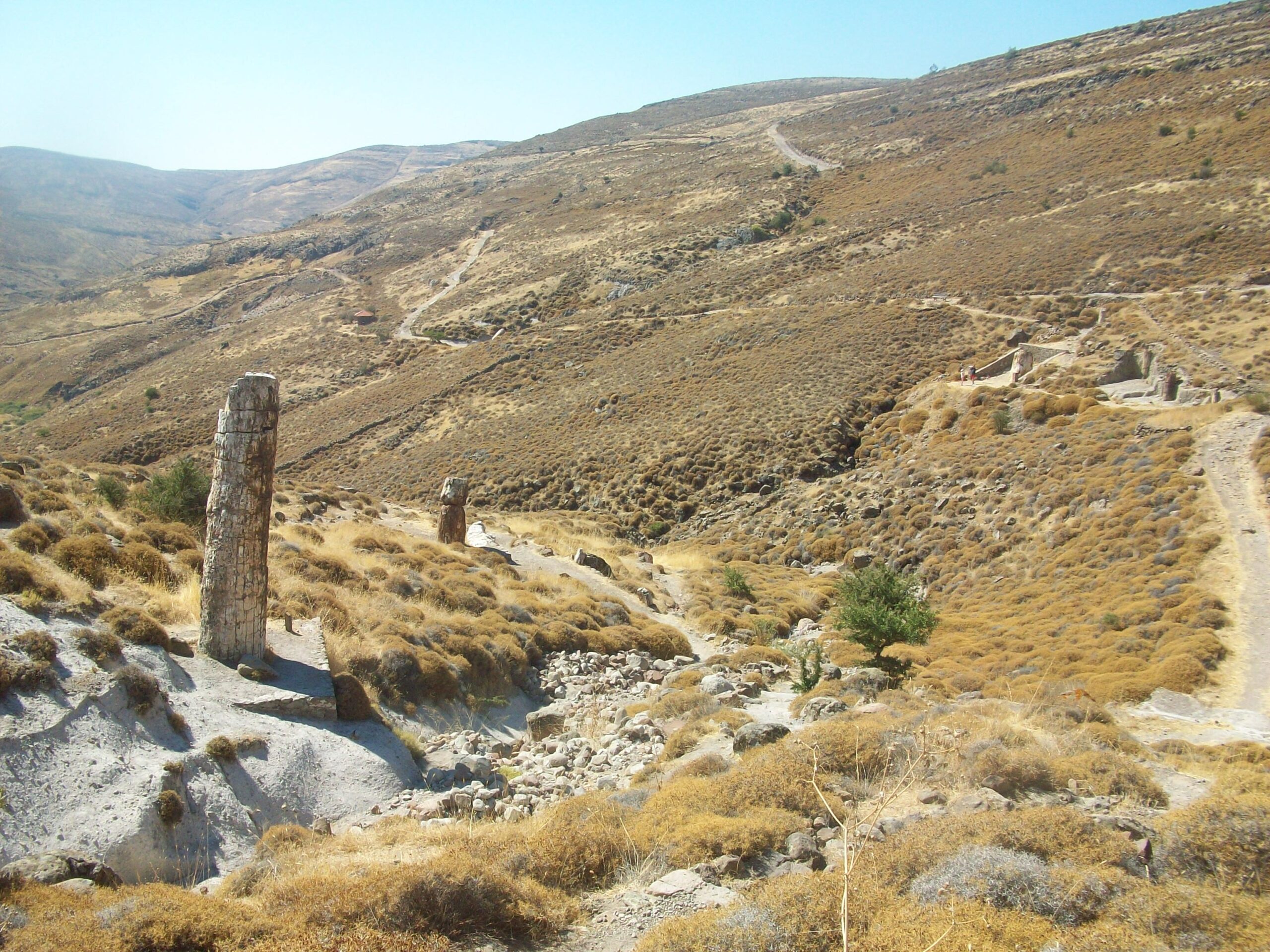 In western Lesvos, where lava and volcanic ash meet the deep blue Aegean Sea, time and the waves slowly reveal fossilised tree remnants that lived millions of years ago. Large and small fossilised trees, in a myriad of colours, numbers and variety, stand erect or lay scattered on the ground, their roots and branches entwining mysteriously.