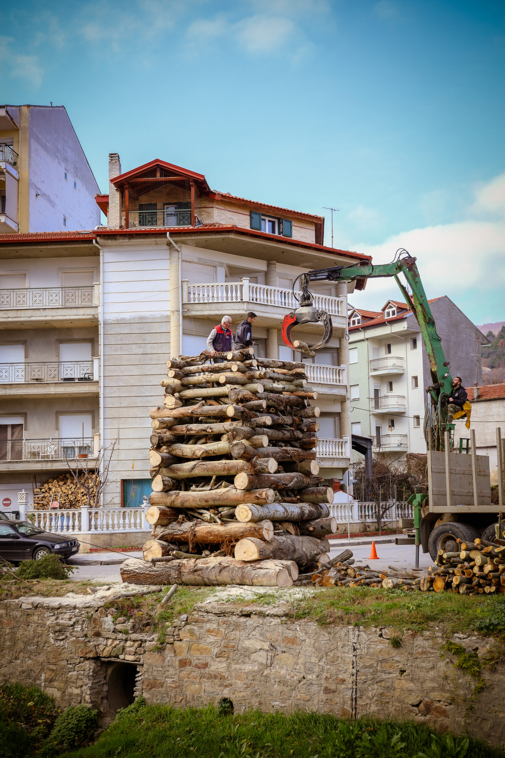 The late historical folklorist of Florina, Lazaros Mellios, describes the preparation in the old days in his book “Kalanta and fires in Florina” -1995): “Once the preparation started, months before. All the youngsters would divide up into groups according to their neighbourhood or village and head to the mountain to collect wood, mostly cedars, which crackles loudly when burning and is believed to ward off evil spirits. They would also get timber from the houses by shouting out to the people inside: “wood for Kalanta”. The goal was to gather the most wood and to have the biggest fire in the neighborhood. Tradition dictated that some of the wood had to be stolen, so they would plunder some from the yards of other houses at night and the occupants, more often than not, would give chase. Of course, what was of particular value was looting the firewood from the other groups. So every night, someone from the group would be on watch and guard the wood.”