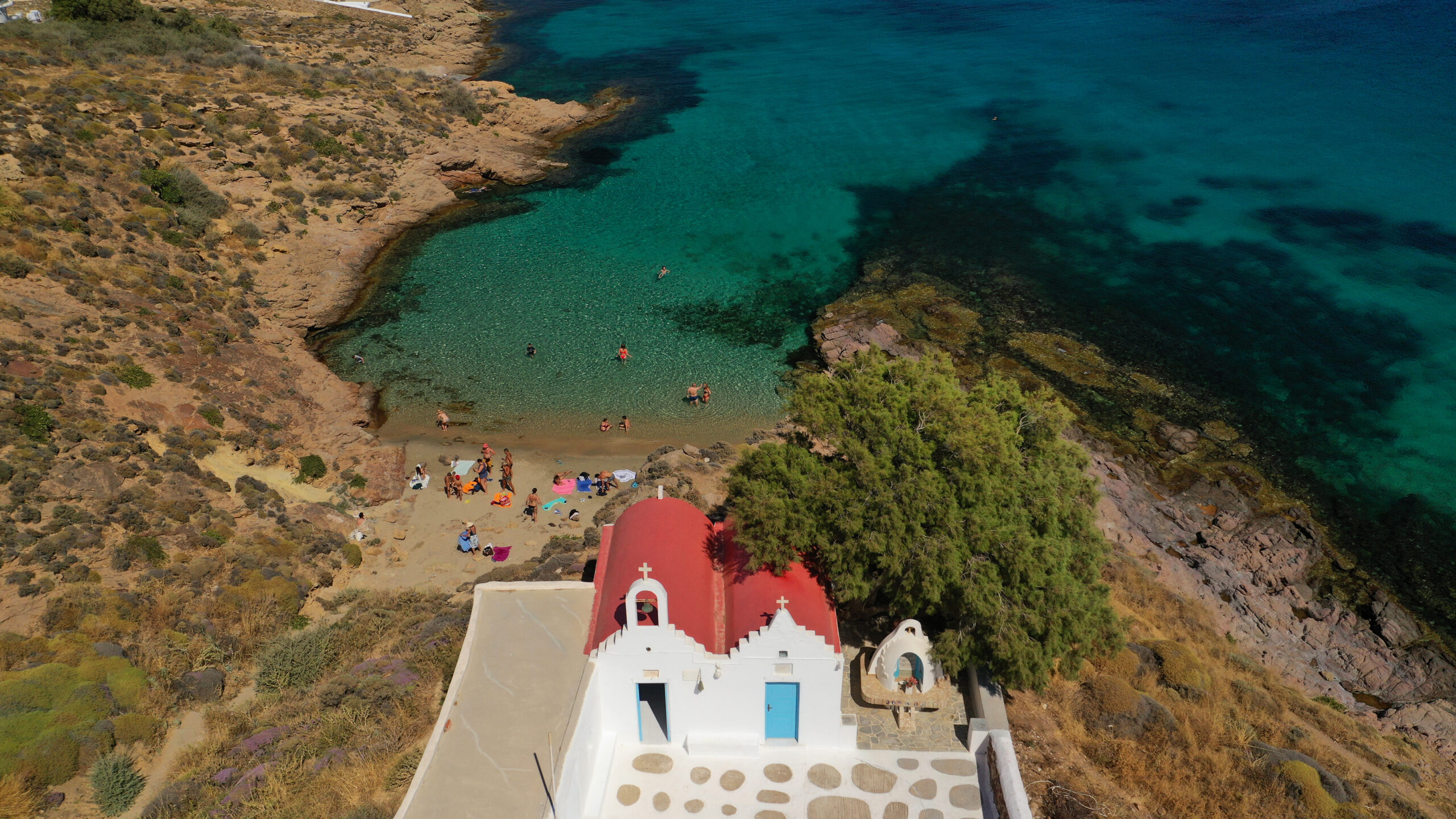Agios Ioannis, also known as Shirley Valentine beach after a 1980’s British film, is organized with sunbeds and umbrellas and has a nice view of Delos. It attracts foreign and Greek visitors from neighbouring Ornos and the shallow bay is popular with families. There are taverns, hotels and bars in the small whitewashed outpost that has grown around the beach.