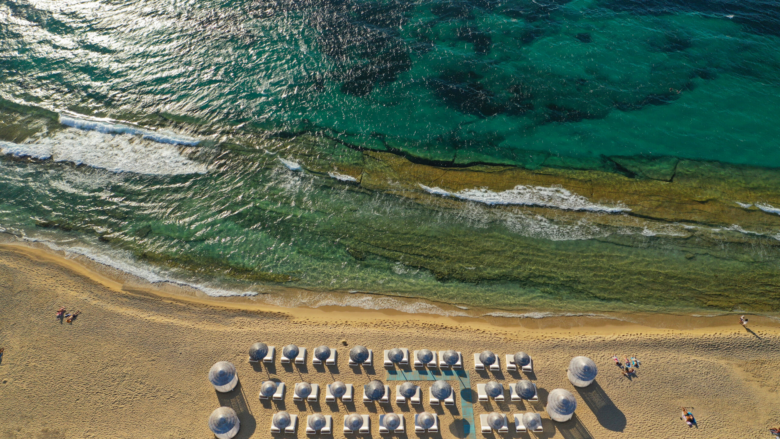 taverns and hotels, it has sunbeds and umbrellas and a nice sunset view. Its sheltered shallow waters attract families.