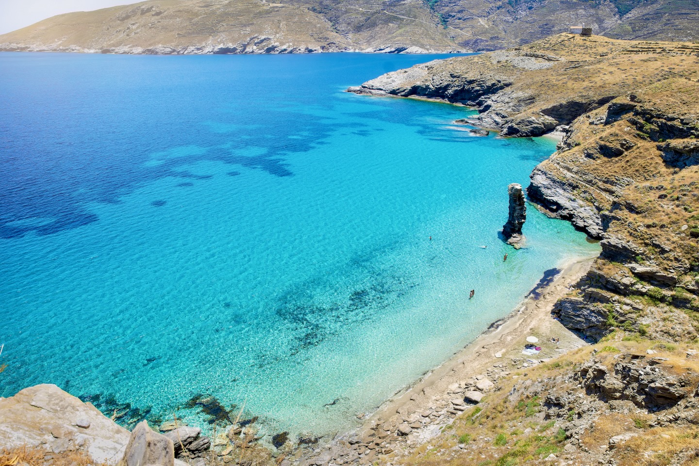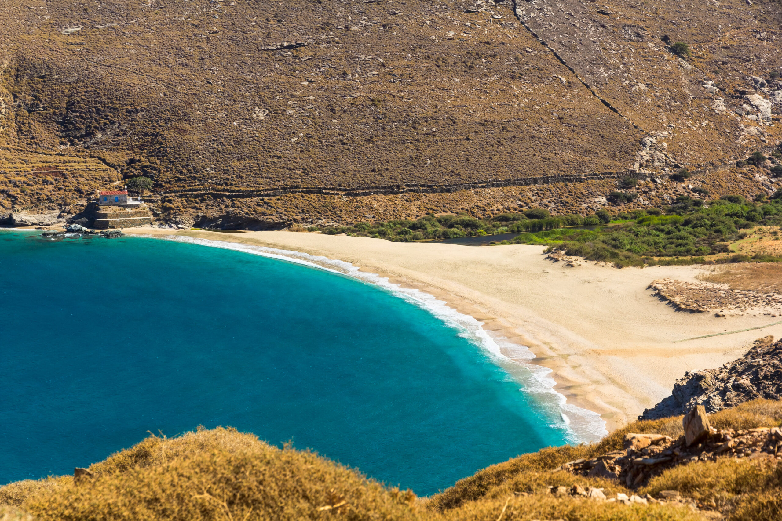 Looking at it from above, you’ll see one of the island’s prettiest beaches, with crystal-clear waters and impressive cliffs. It is organized in one area and has a taverna, but there is also plenty of free, open space. The beach is located on the northwest coastline of Andros, 17 kilometers from Gavrio and can be accessed by an asphalt road and a passable dirt road. Visiting it on windy days is not recommended.