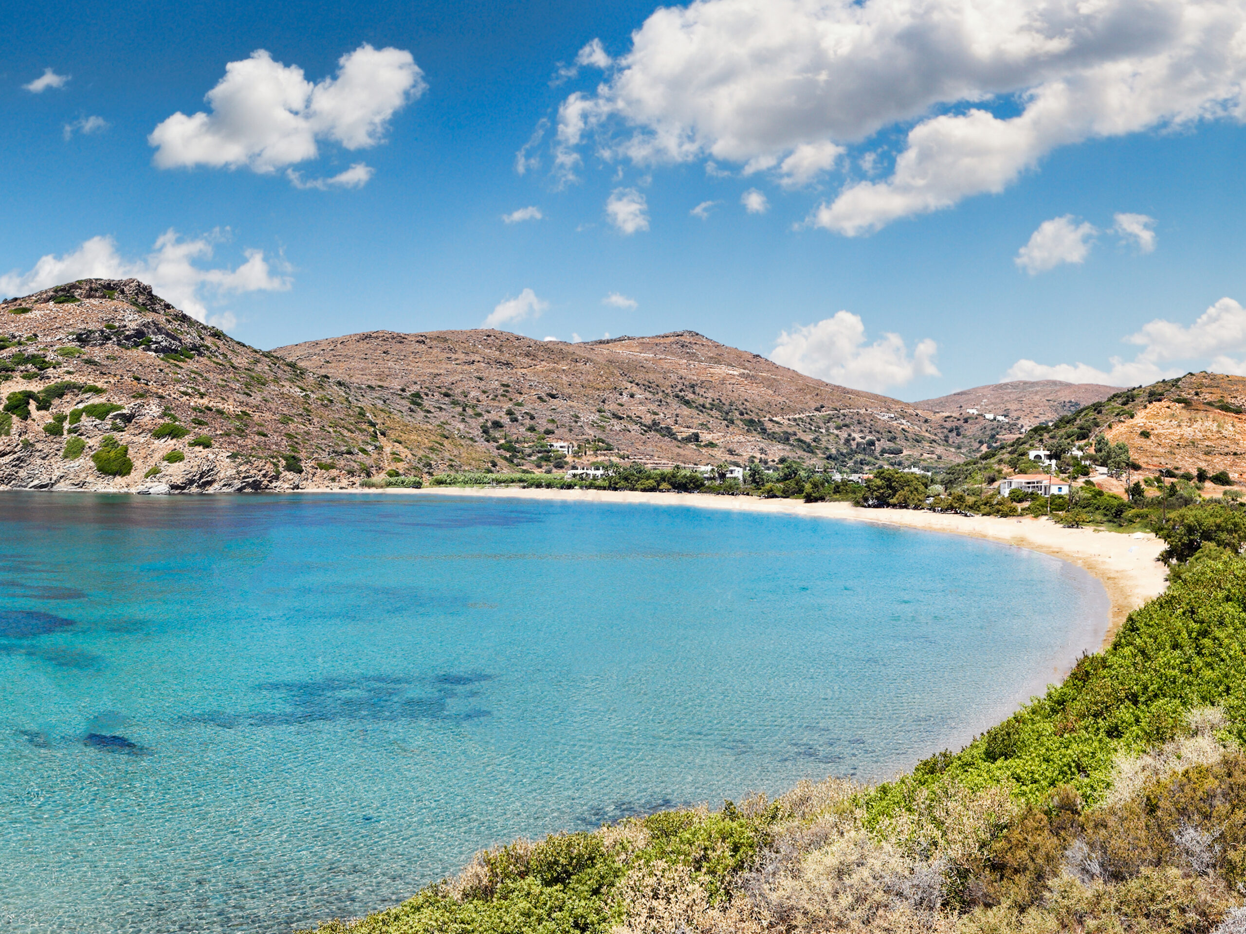 Just two kilometers from Gavrio, Andros’ main port, this is a long beach with fine golden sand, beach bars and tavernas. A large part of it is organized, but it’s also exposed to the wind. It is located on the main road leading from Gavrio to Batsi.