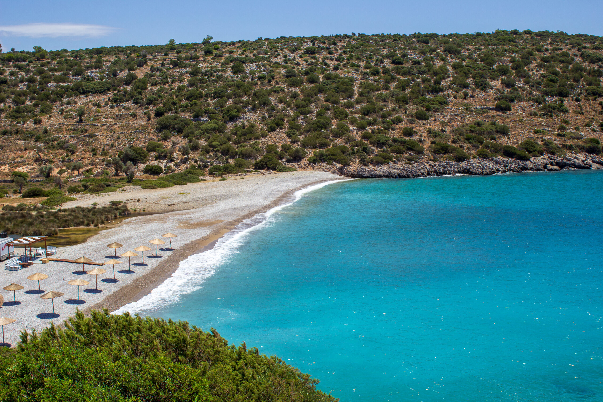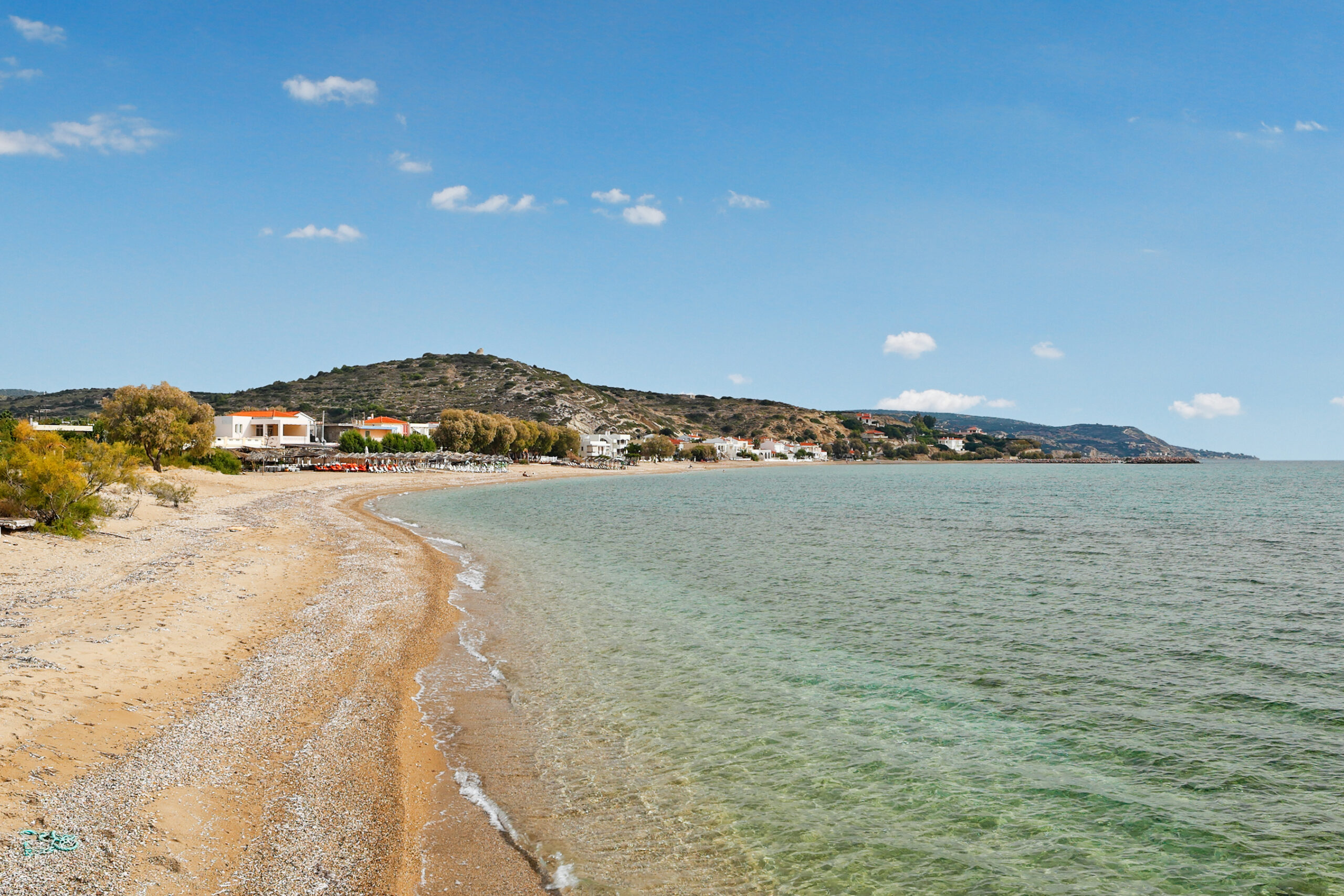 A small village on the western coast, Lithi has a small beach at its feet and it is a thin strip of sand within a pretty natural harbour with fishing boats moored along the jetty. Shallow seas are perfect for families with small children and there are a cluster of seafood taverns to watch the sunset over the Aegean. Protected by hills with dense greenery, the beach is organised with parasols and loungers, but there is still room to play on the sand.