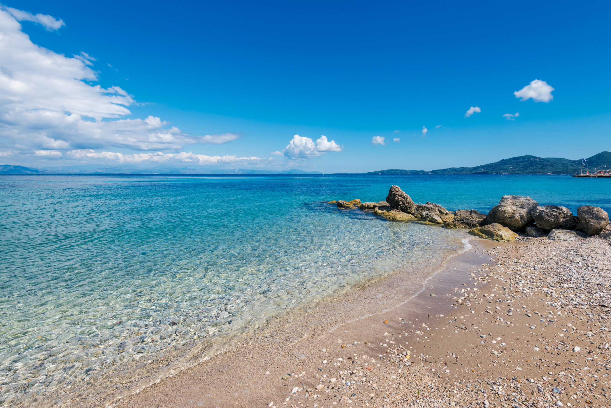 A pebbled beach, with views of the Albanian mountains opposite. Calm waters, parasols, sunbeds, water sports, restaurants, and beach bars.