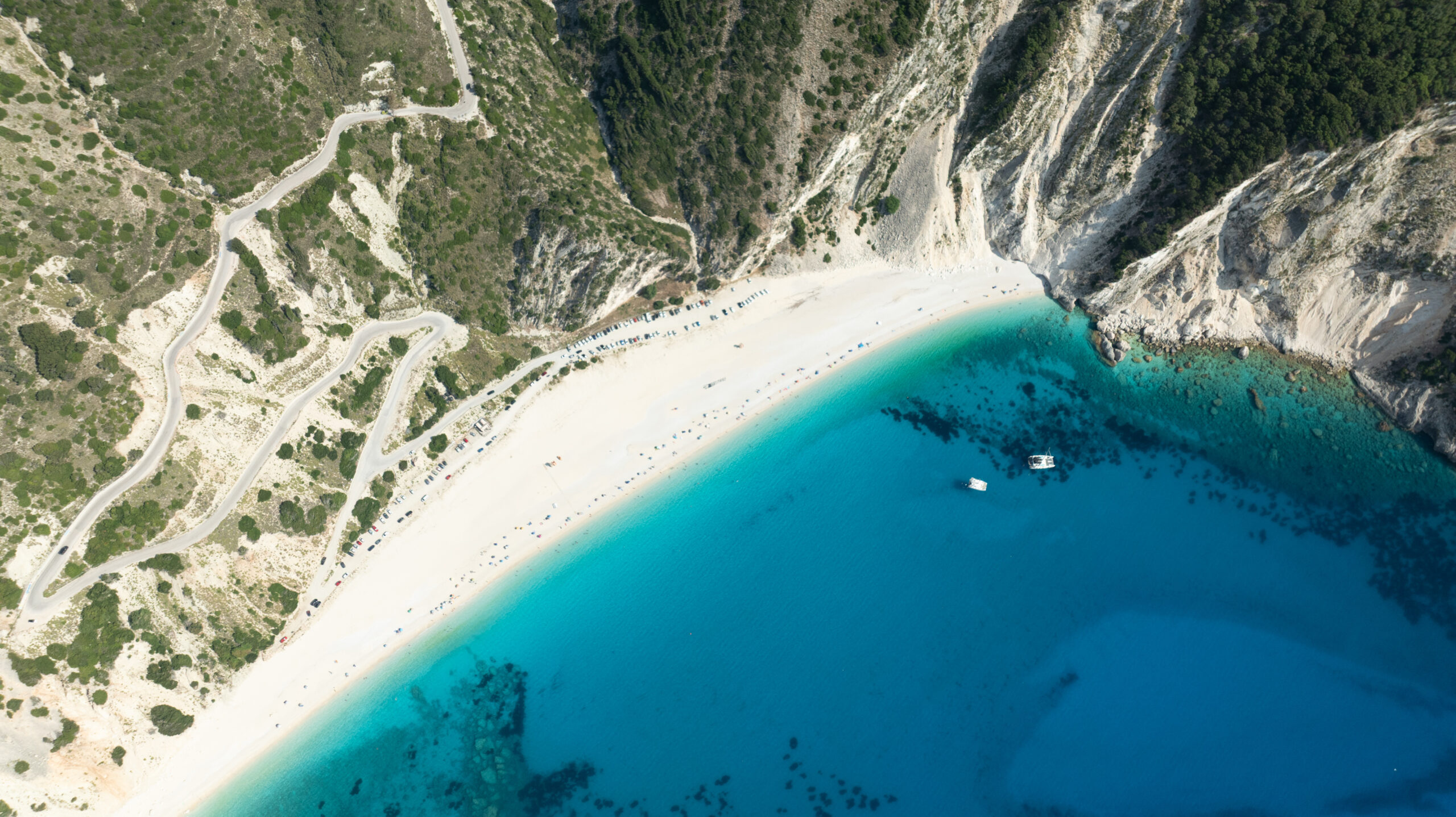One of Greece’s most photogenic beach, Myrtos stuns with its dramatic cliffs, white pebbles, and ever-changing hues of turquoise and sapphire. It lies below the village of Divarata and is partially organized, but still retains its raw, elemental beauty.