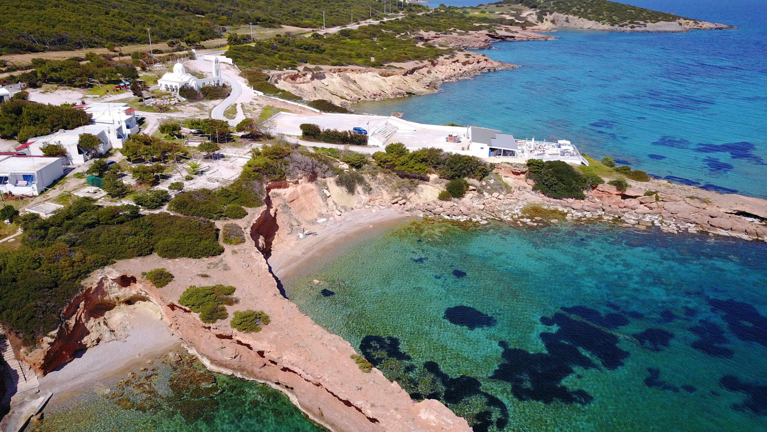 The seaside settlement of Chamolia, near Vravrona, is 45 kilometers and about a 50 minutes drive from the center of Athens using the Attiki Odos. If you want to avoid paying tolls, the distance is actually a little shorter but the roads are slower. Whichever way you take, on reaching the village and after passing the main beach, head to the right. After 500 meters you will find a small dirt road that leads to the lovely Mikri Chamolia. The aquamarine waters of the sea, the natural background, and the zigzags of the coastline are more suggestive of an exotic island than the humble Attican coast.