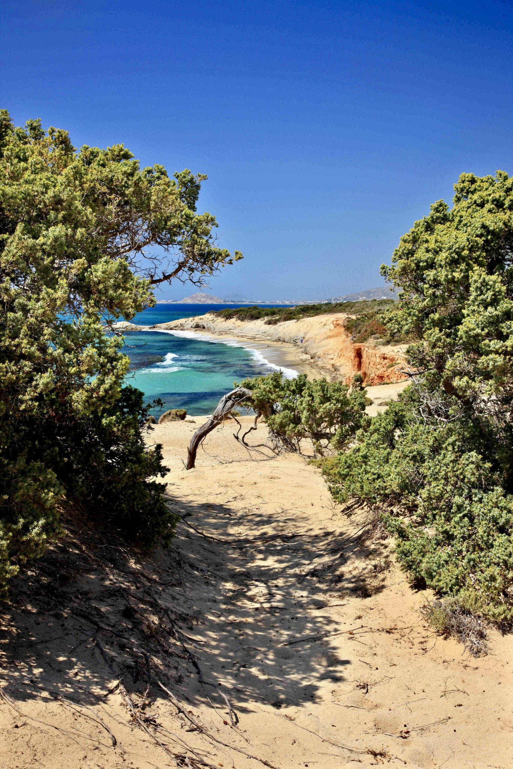 Even in high season the beach is never crowded, and the fine sands are a glorious backdrop to the views over the blue-green Aegean towards Paros.