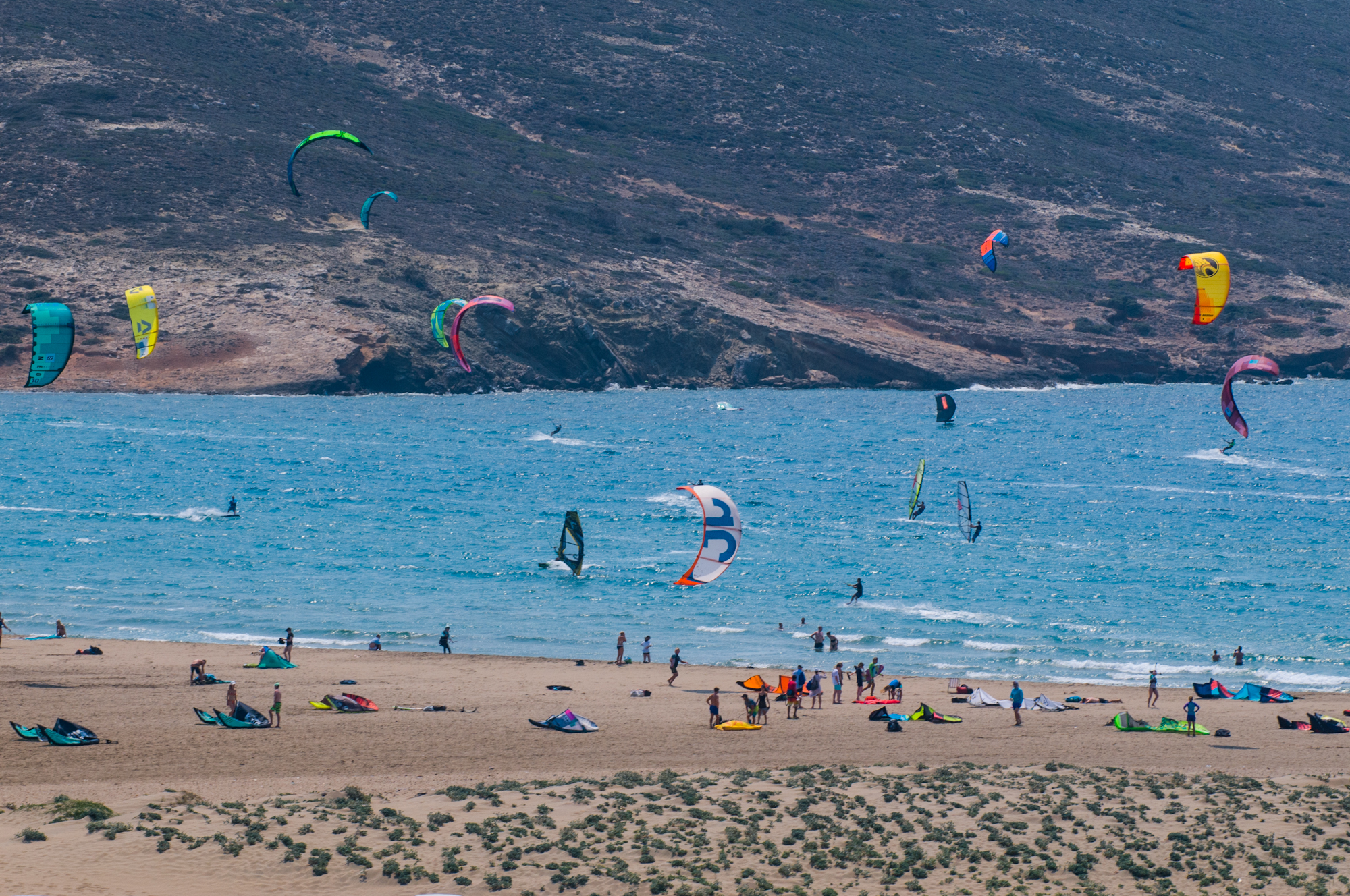 Prasonisi: This sandy strip of land stretches out into the sea. In winter, the high tides mean it stands alone. In Summer, when the water levels are lower, it joins the mainland.. It is located at the southernmost tip of.Rhodes. The sea on one side always has waves, while on the other side it is still. The area is loved by surfers as there are very strong winds in July and August. There are windsurfing schools, hotels, beach bars and more. On the island there is a 14 metre (46 feet) high lighthouse built in 1890, and a small beach on its eastern side. It is 92 kilometres (57 miles) from the city.