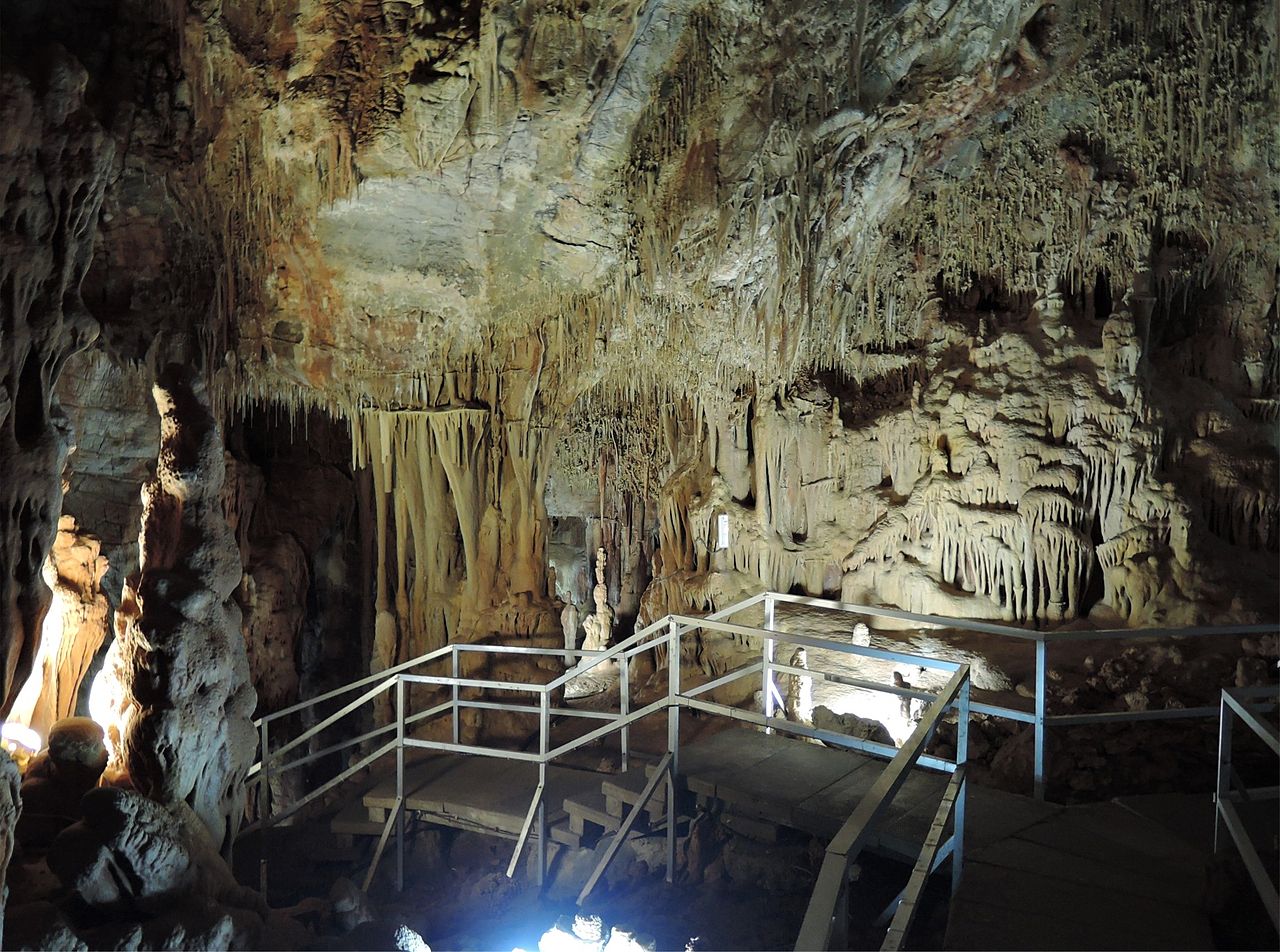 Located near Nea Moudania in Kassandra, Halkidiki, at an altitude of 300 metres on the western slope of Mount Katsika the internationally renowned cave is admired for its fossilised skull and bones of the Petralona Archanthropus unearthed in 1959, which dates back 700,000 years, as well as impresive stalactite and stalagmite formations. Excavations have also revealed a wealth of Paleolithic tools, bones, and long-extinct fossilised animals.