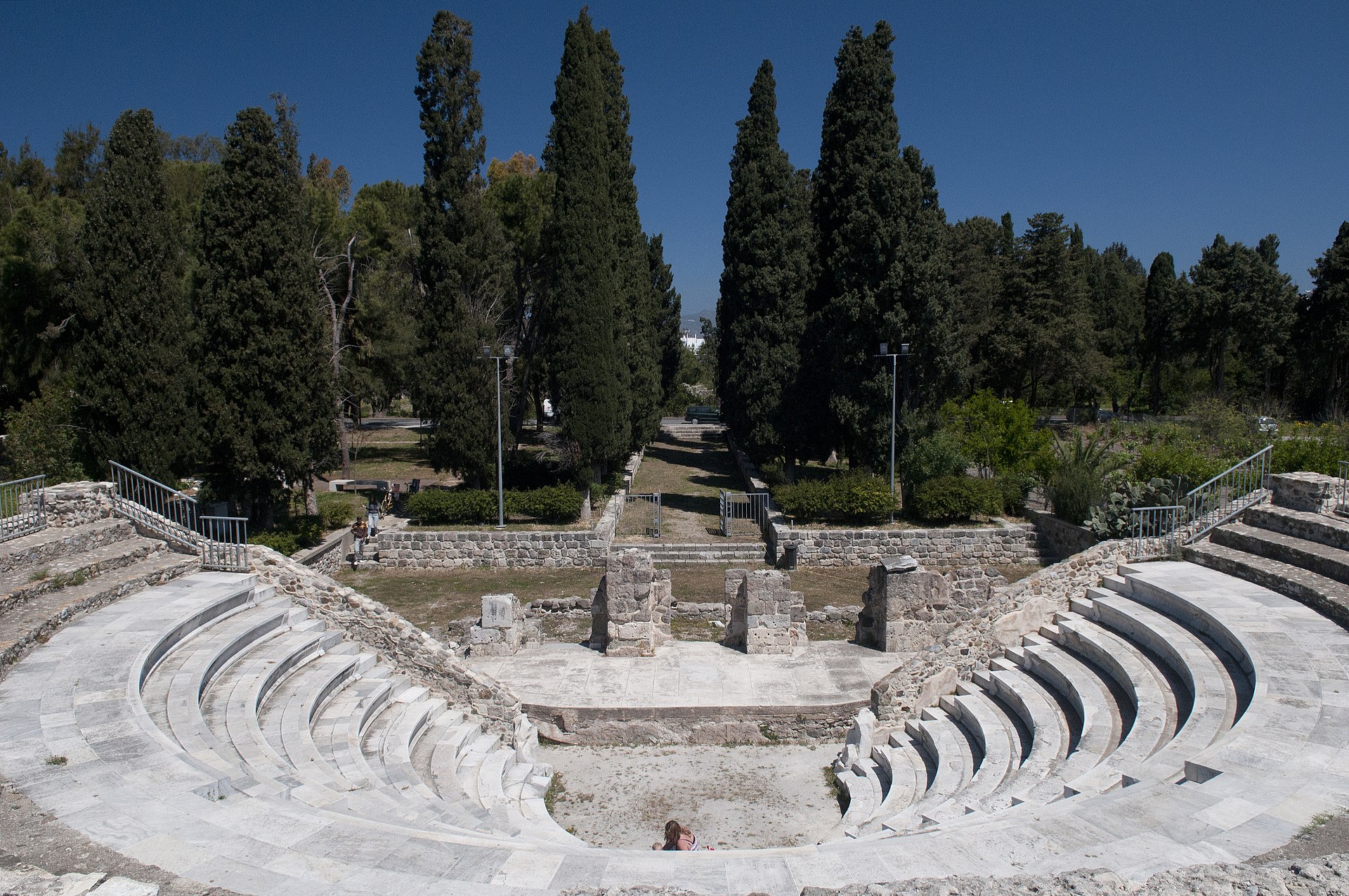 During the summer many events are held here. It was found in relatively good condition during excavations carried out in 1929 by Italian archaeologists, and has been restored. Approached from Gregory V Street opposite the West Zone, archaeologists believe that it may have been built on the site of an earlier public building, perhaps the Bouleuterion, a council assembly building which would have been found in a democratic Greek city state. It was originally a covered building with a capacity of 750, created between the 1st and 2nd centuries for the performance of music.