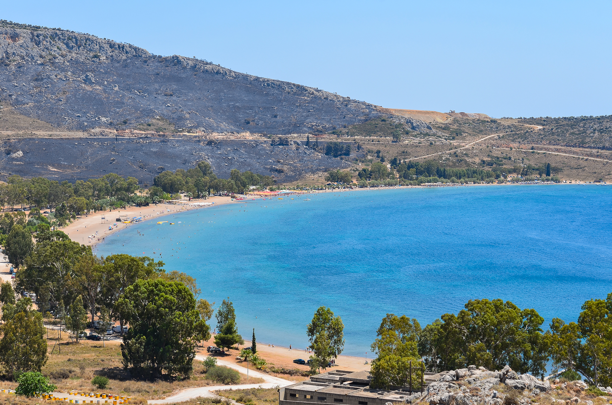 A long beach 20 kilometres from Nafplion, Kandia has something for everyone. There is a famous beach bar that is a magnet for a young, glamourous crowd at weekends with parasols and sunbeds on a pebbly shoreline, while further down families play in the sand, and after at the western edge there is seclusion and peace. The sea is clean but it can get wavy in the afternoon, a fact exploited by the watersport rentals who hire out windsurfing equipment.
